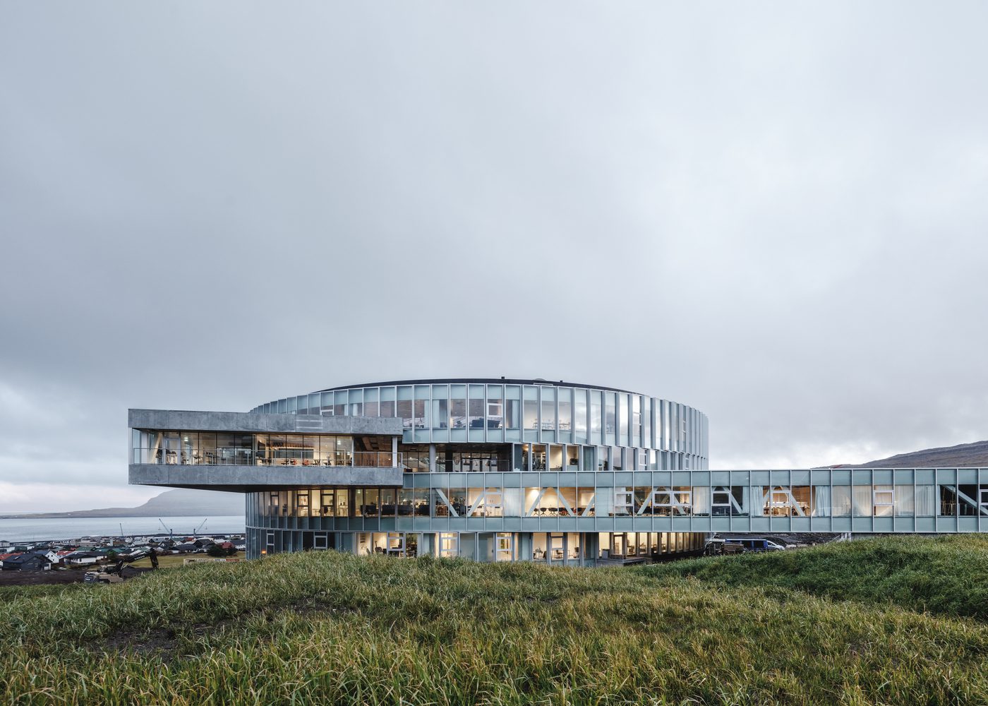 Seen from outside, the exterior glass façades are mounted in a sawtooth shingle that allows the straight elements to form a soft circular shape and blend into the natural surroundings. Over time, grass planted on the rooftops will slowly grow to allow the education center to disappear into the Faroese landscape.