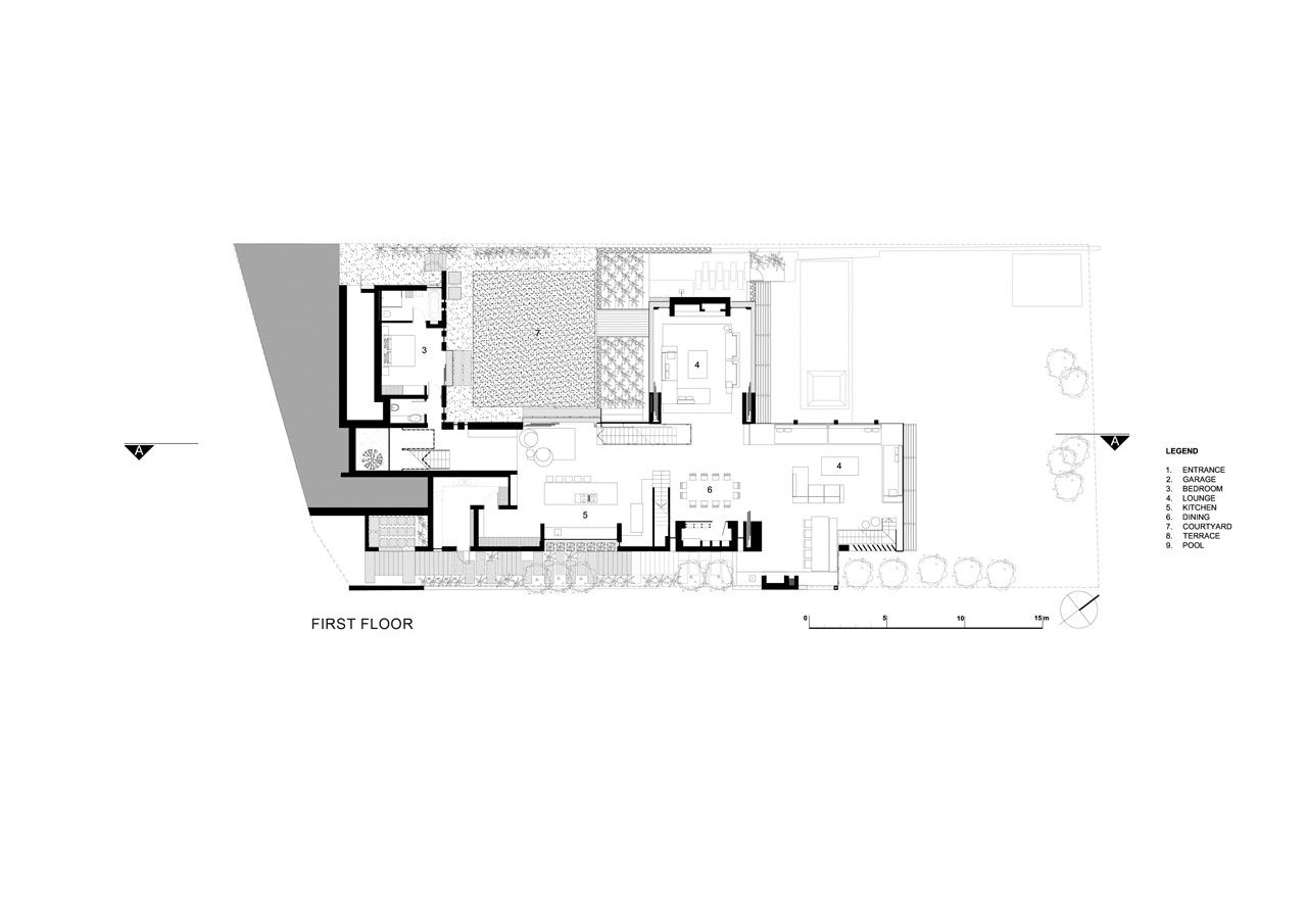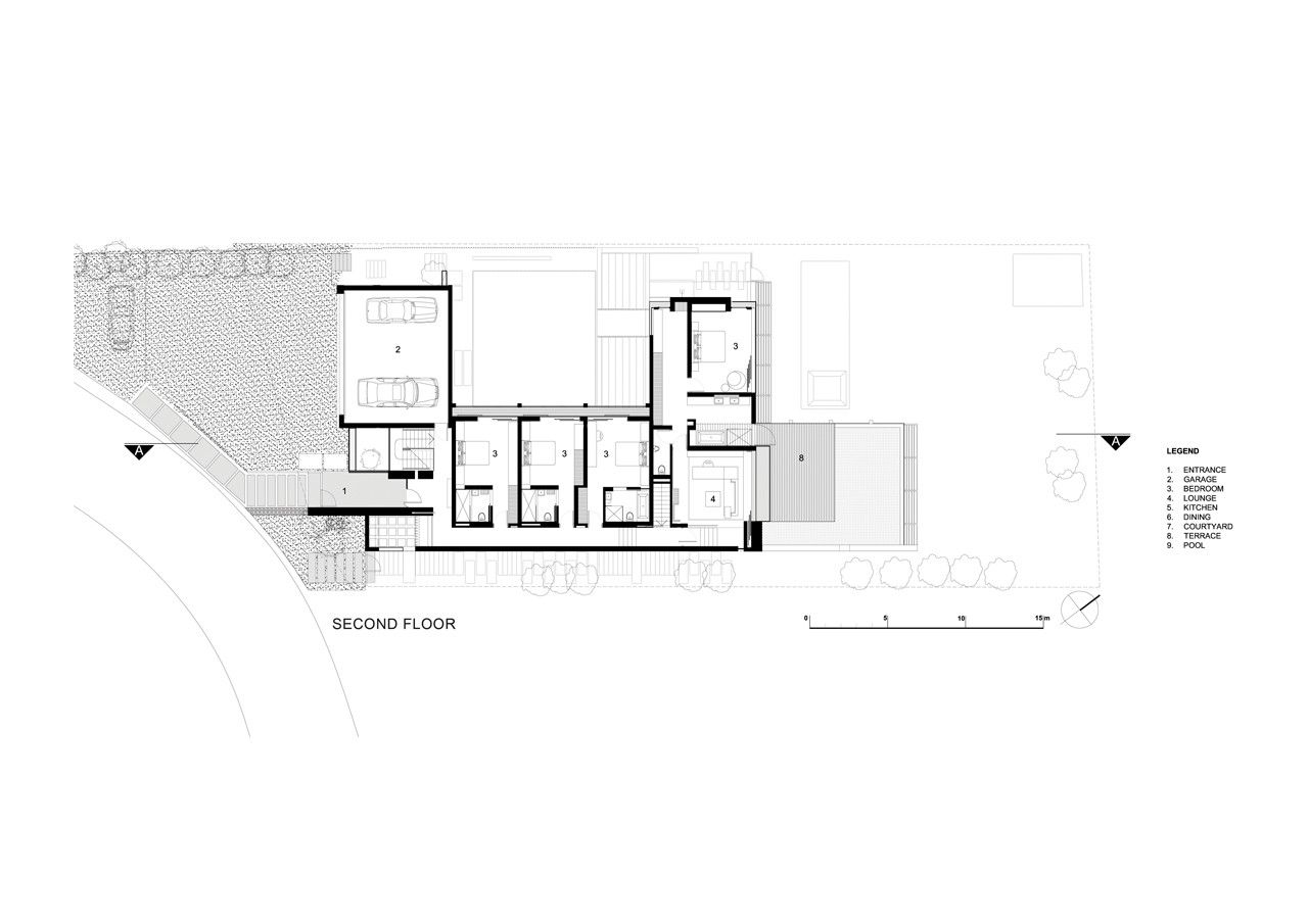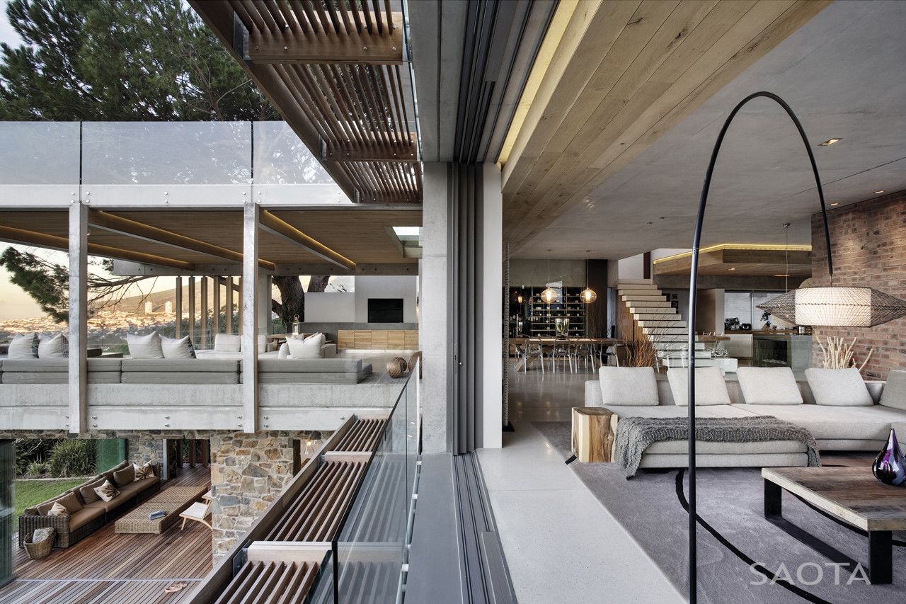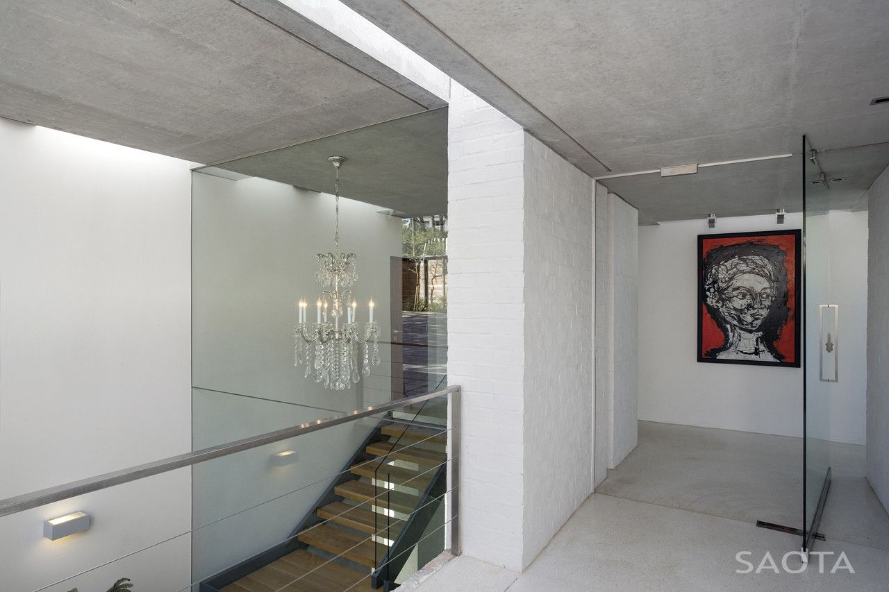 SAOTA relied on robust uncluttered finishes of off-shutter concrete for soffits and various walls, painted bagged brickwork, specialized polished concrete topping and oak cabinetry and ceilings. To amplify the sense of openness of the rooms and the gardens, the living rooms have large openings of sliding aluminum doors – this openness is further enhanced by glass handrails to successfully blur the boundaries of interior and exterior.