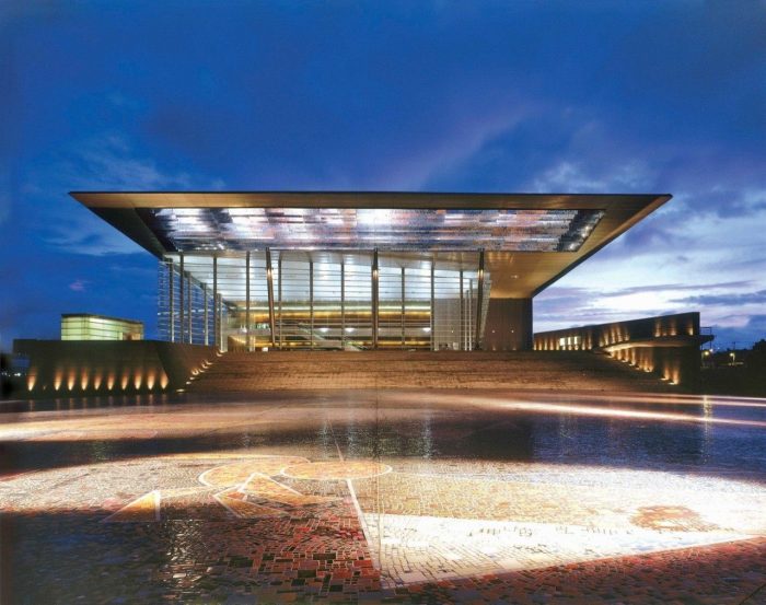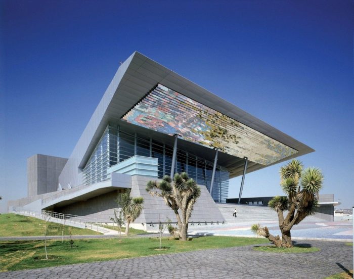 The project for Gota de Plata Auditorium Theatre, designed by the architects Jaime Varon, Abraham Metta and Alex Metta from Migdal Arquitectos, is one of the main elements of this large ensemble; it is situated at the south end of the Culture Park and given its position within the complex, it acts as The Visual Culmination of this great “sea of colors”. Hence arises the idea of reflecting the mural square through a reflective glass roof, set 25 meters above the ground and with a 40 meter overhang on both ends.