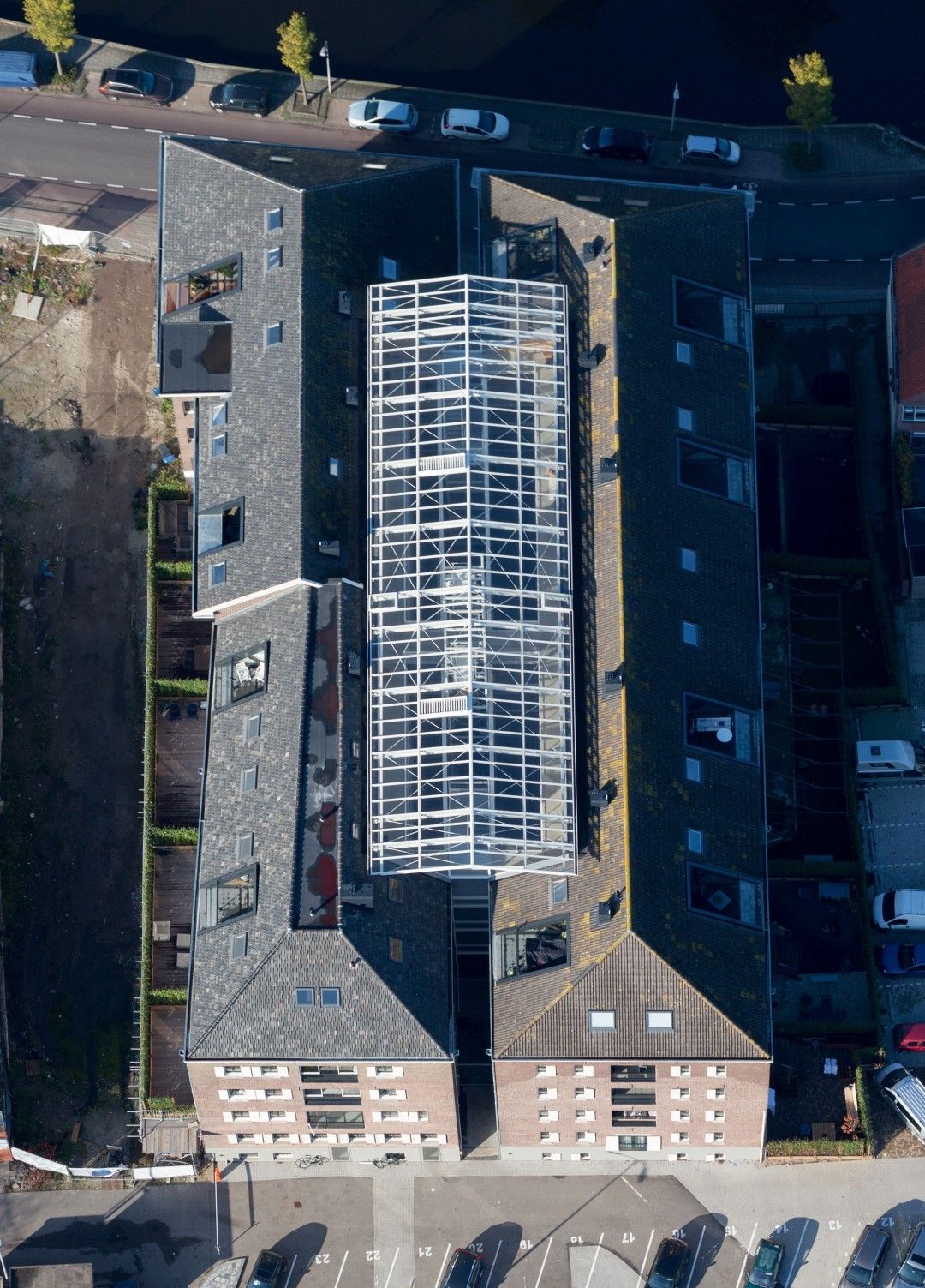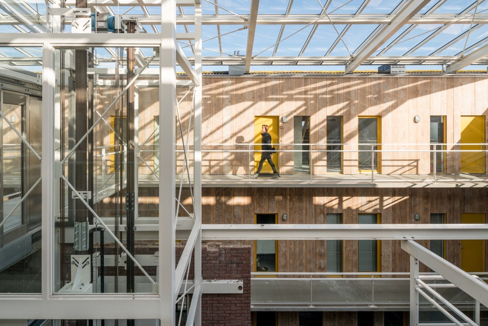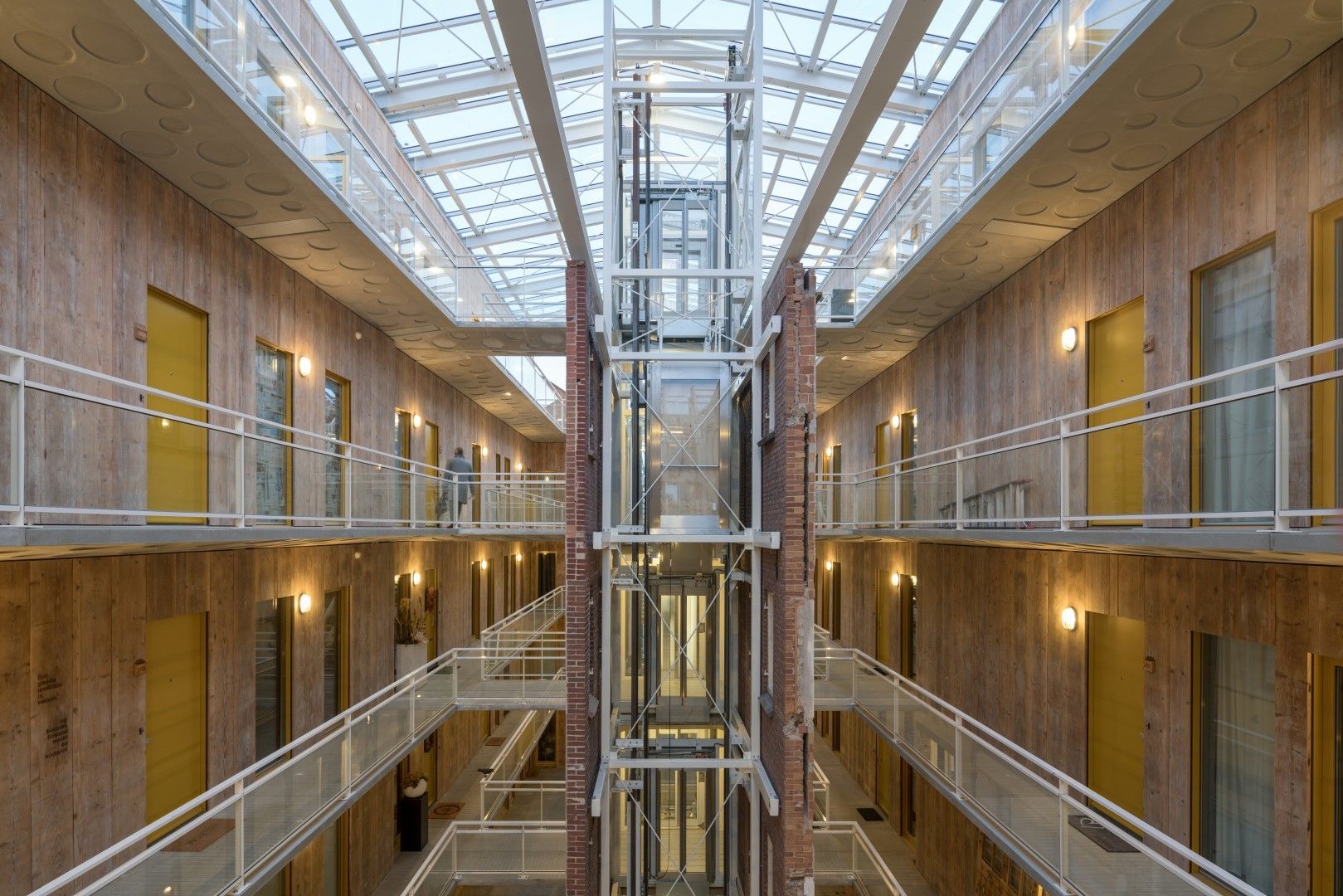 The original Gouda Cheese warehouse of ‘De Producent’ is a national monument. Therefore the main changes in the transformation to loft homes are only visible once you enter the building. The removal of pieces of the floor and facades on both sides of the original ventilation alley and the addition of a glass roof creates a royal atrium that brings light into the building. Parts of the original alley facade have remained up and running as hoistway. The residents are able to reach their apartment on one of the four floors through two glass elevators which go up and down along the historical facades while experiencing the building to the fullest.