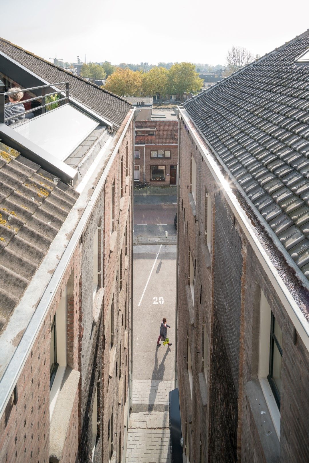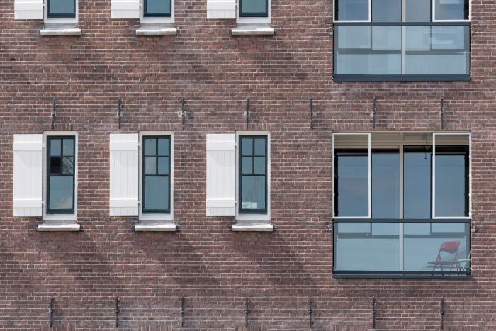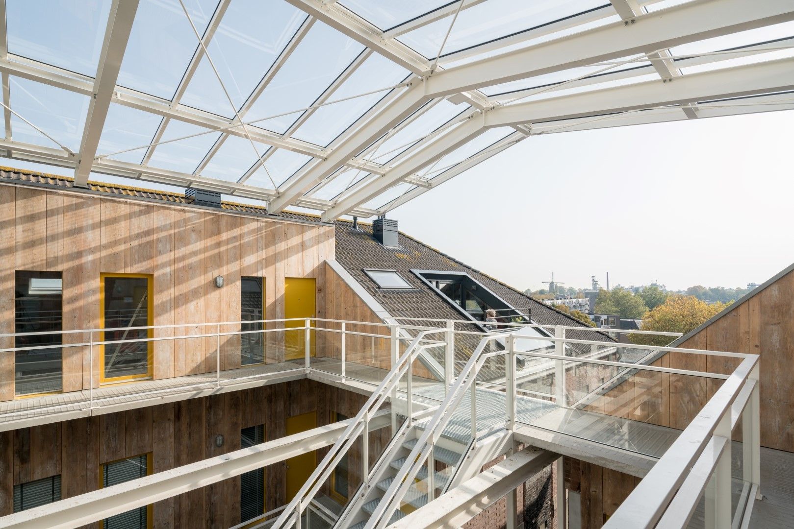 The original Gouda Cheese warehouse of ‘De Producent’ is a national monument. Therefore the main changes in the transformation to loft homes are only visible once you enter the building. The removal of pieces of the floor and facades on both sides of the original ventilation alley and the addition of a glass roof creates a royal atrium that brings light into the building. Parts of the original alley facade have remained up and running as hoistway. The residents are able to reach their apartment on one of the four floors through two glass elevators which go up and down along the historical facades while experiencing the building to the fullest.