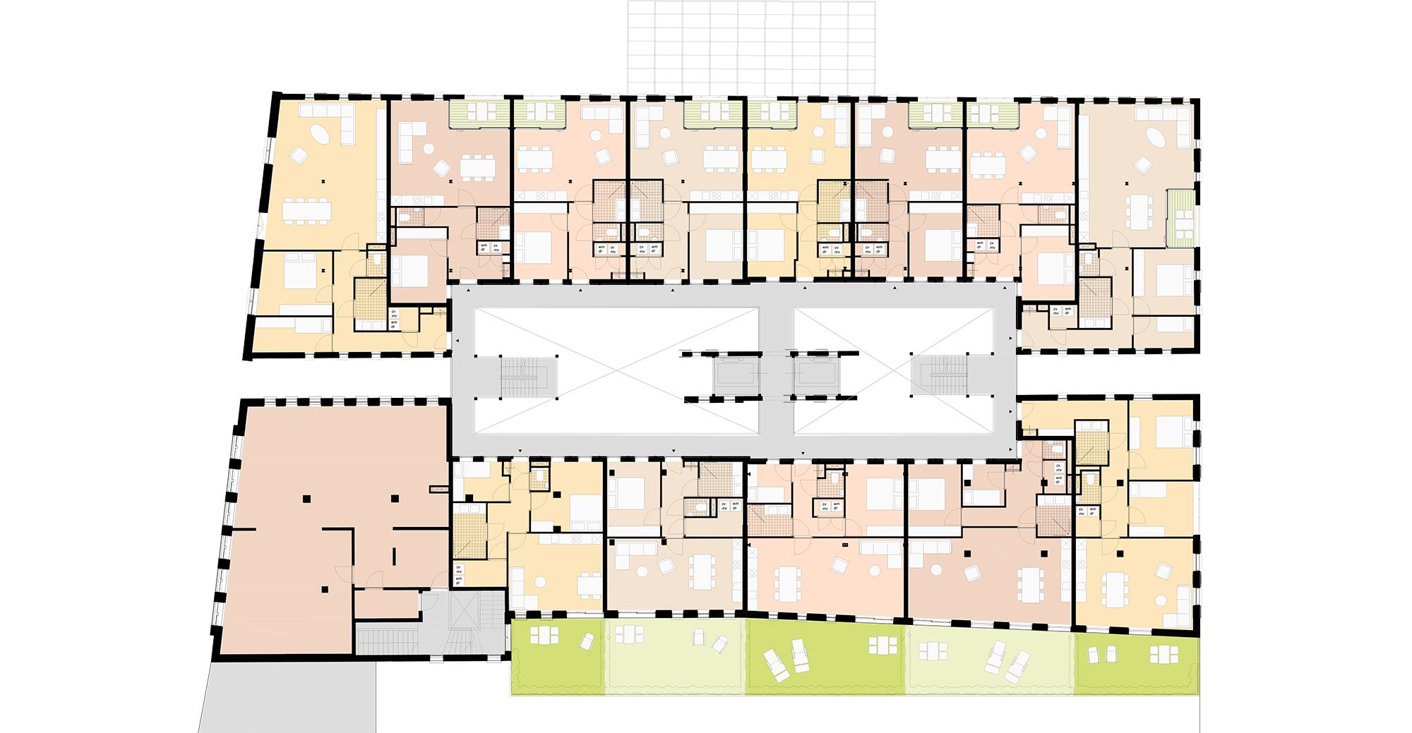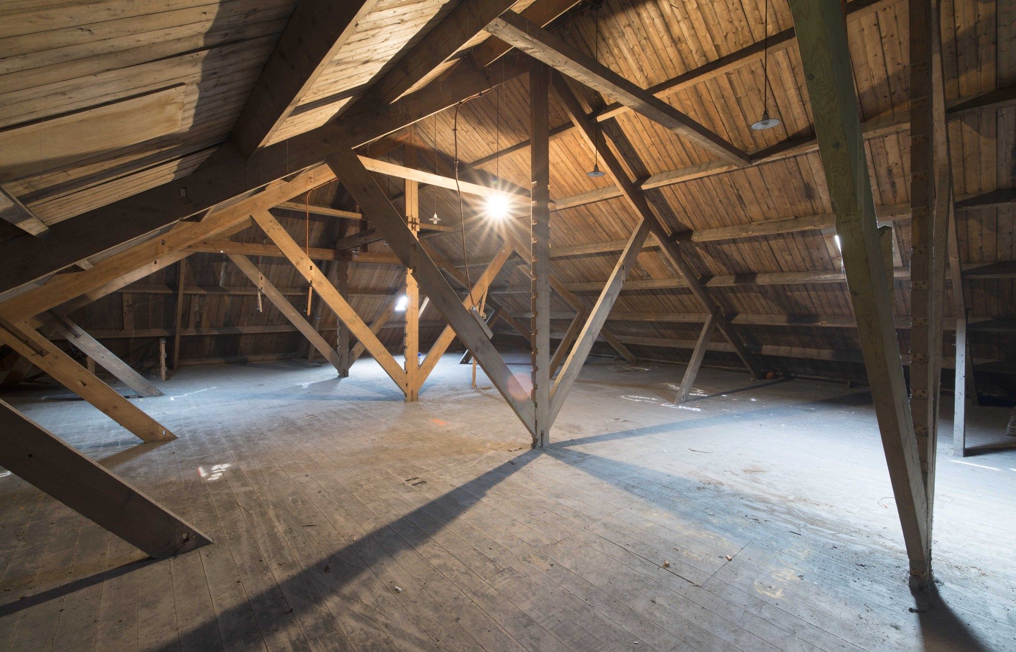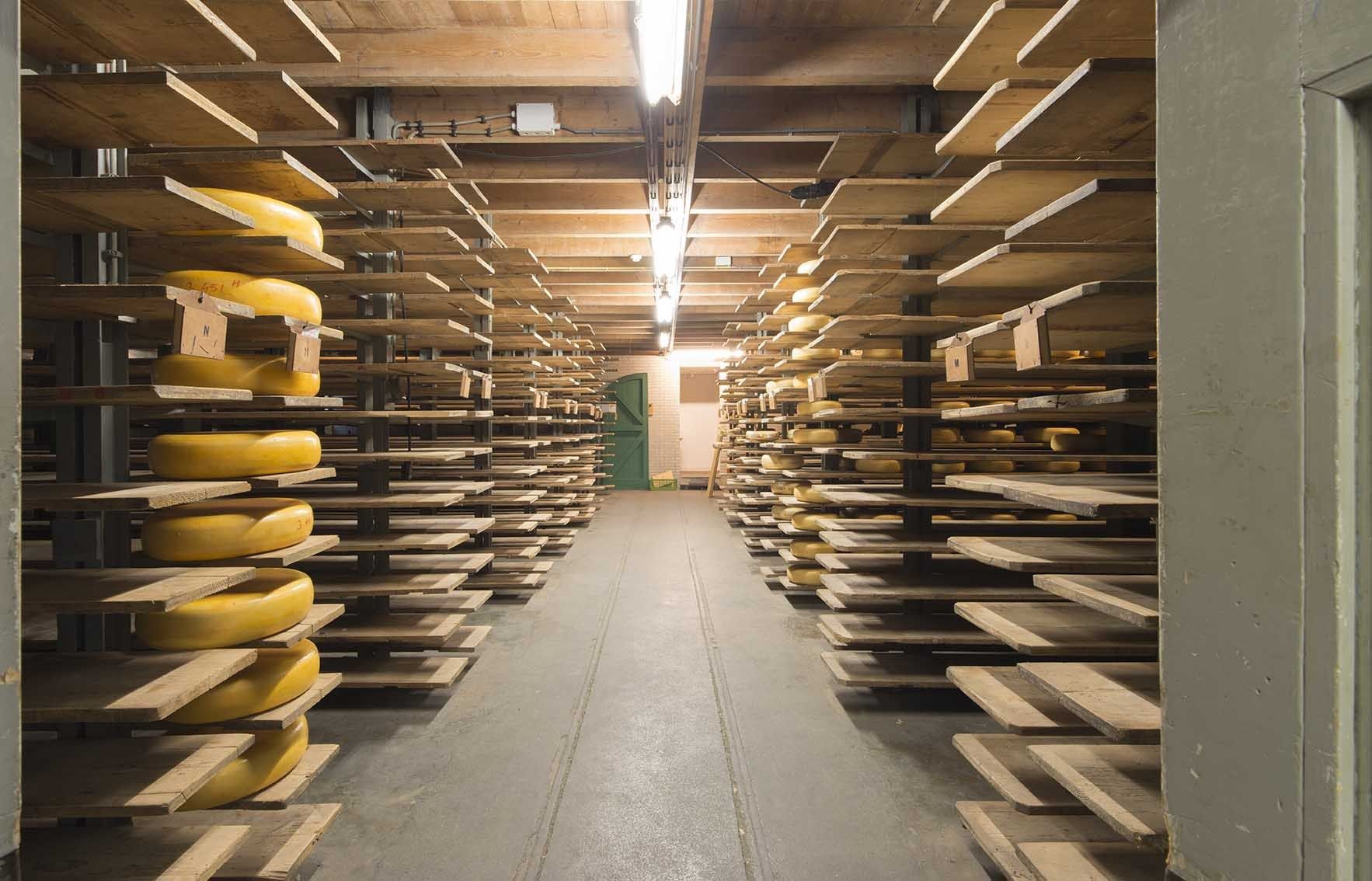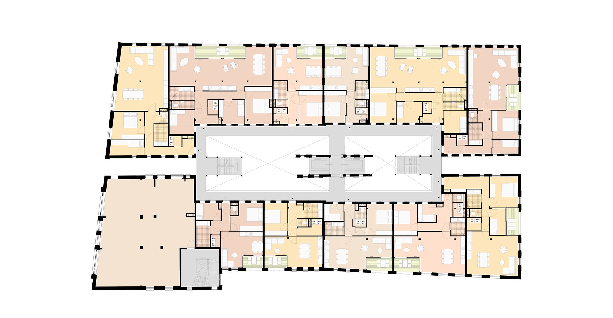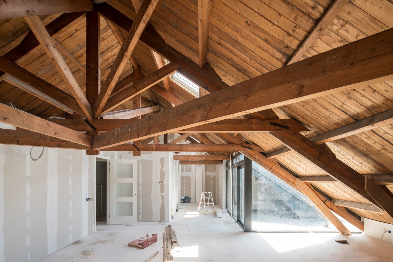 To carry the weight of a million kilos of cheese, the warehouse had two separate construction systems. One for the building and one for the cheese. The original construction is re-used and maintained unfinished and visible in the loft apartments; steel columns, wooden and concrete ceilings, and wooden attic beams. The existing floors are used as lost formwork for the new concrete floors in such a way that the original wooden ceilings remain visible and give a historic touch to the apartments.