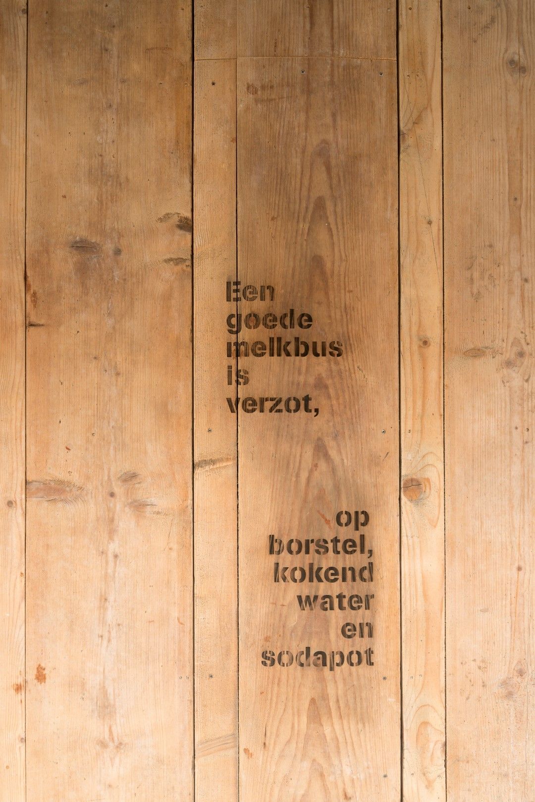 For this transformation, Mei saved as many elements as possible from the former Gouda Cheese warehouse to give them a second life in the new construction. The shelves, where cheese ripened for over 100 years, are re-used as finishing touch on the facades in the atrium. After extensive research, it turned out possible to treat the cheese boards with monomers to meet the fire resistant requirements. The signs of use on the boards remained visible after this treatment. In some of the cheese shelves, a saying is carved as an extra meaning. These sentences come from a typical Dutch board game that was found in the archive of De Producent. The attentive resident or visitor will be surprised by these references to the history of cheese making. Also, the original trays, which hung onto the shelves to manage the maturation process, are being re-used; as house numbers.