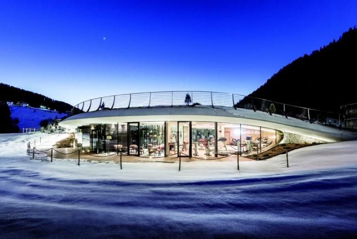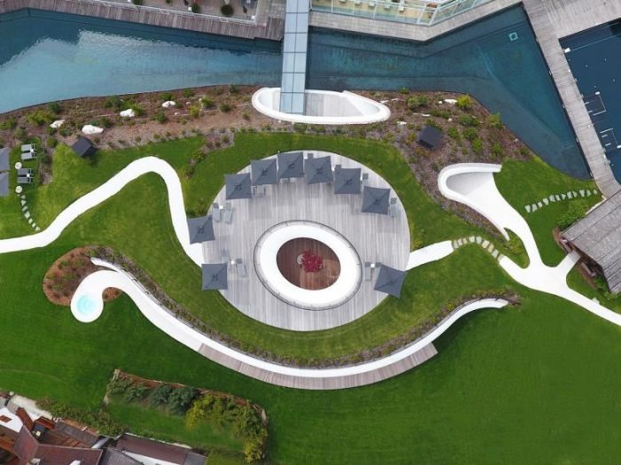 The new SPA, finished in December 2016, with a jubilant shot of dynamic contemporary architecture was designed by Perathoner Architects. As the spa is located in the garden area of the hotel, much consideration was given to how to minimize the visual impact of the new building on the site.