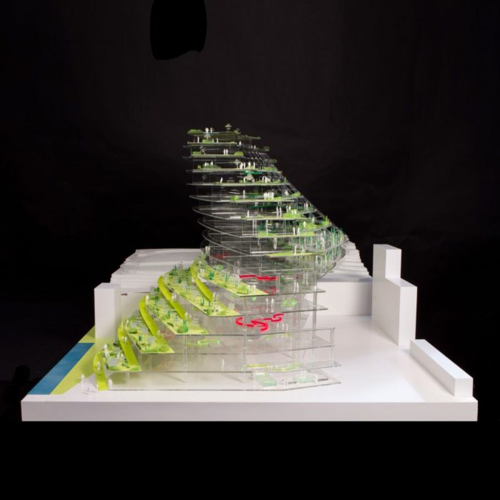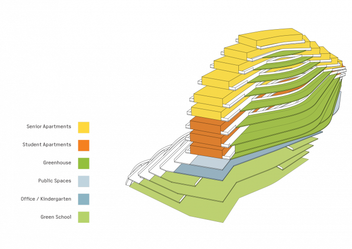 The building is formed by two adjoining arcs. The green school and accompanying greenhouse constitute the public arc and allow for internal and external circulation through the building with the vegetation growing all around. Nine levels of housing for students and seniors twist slide and shift to create wide private terraces and maximum daylight exposure.