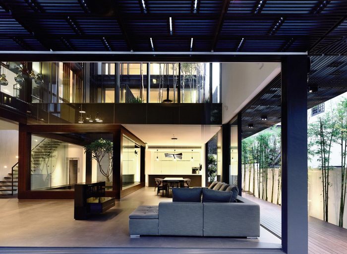 The second story level of the courtyard lies over the dining area and in front of the master bedroom. The full height glass facade facing the courtyard is screened by interlocking vertical and horizontal timber members.