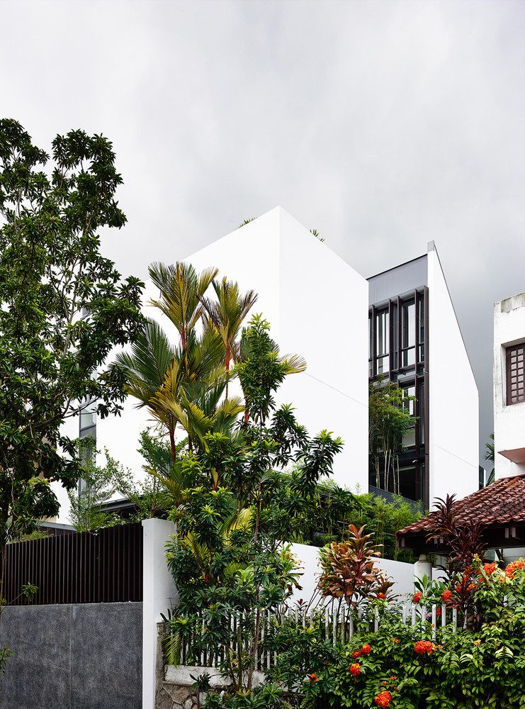 A courtyard of Greenbank Park on two levels sits in the center of this semi-detached house. On the first level, a frangipani tree sits in the middle of a pond, framed by a timber clad box. The double volume living room and the dining room wraps around this courtyard.