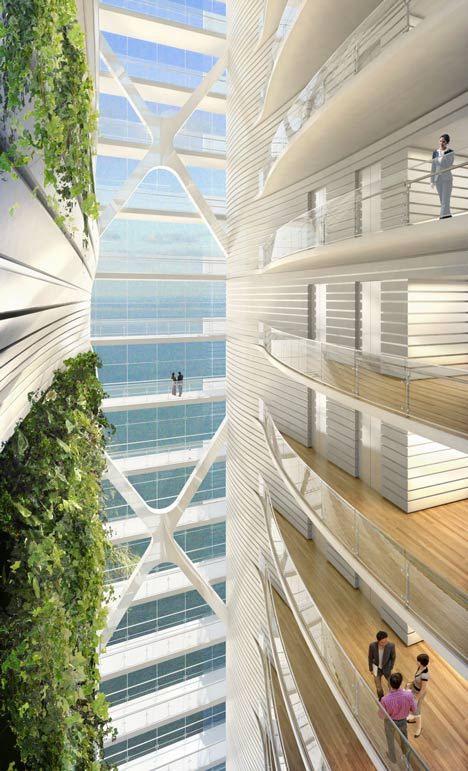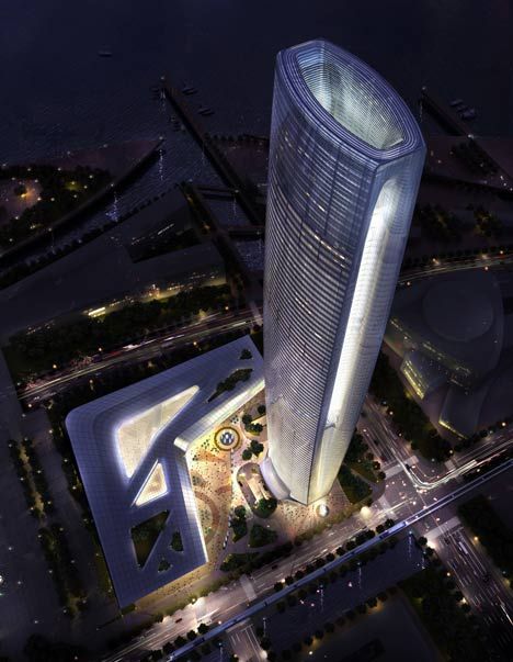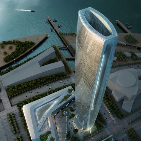 The Greenland Group Suzhou Center is a 385-metre-high tower that incorporates a 30-storey high opening. Designed by SOM for a competition, this skyscraper proposal will be located beside Taihu Lake in Wuijang, China and will contain offices, apartments, shops, and a hotel. As sleek and contemporary as this design is, most of the decisions made were done so to accentuate a green and environmentally driven building. According to the firm, the team included structural and mechanical engineers from the very beginning to define all aspects of the project, where digital modeling of aerodynamics became critical to the shaping of the building.