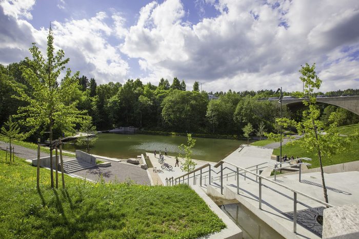Grorudparken (Grorud Park) is one of four new neighbourhood parks in Groruddalen. The park introduces facilities for athletics, play, recreation, youth programmes, social interaction, and cultural activities for the diverse local population.