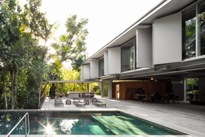 The house is be located in Iporanga, a condominium for beach houses on Guarujá, São Paulo’s coast city, approximately 120km east from the capital. This condo is inside a very well preserved and protected area of the original Atlantic Rainforest. To preserve the exuberance of this native forest the law permitted to occupy only 30% of the footprint of the ground plot surface. The challenge was to accommodate a large program that included five en-suite bedrooms, which demanded not less than 450m2 to be build. To achieve this, it was necessary to split the program in three levels.