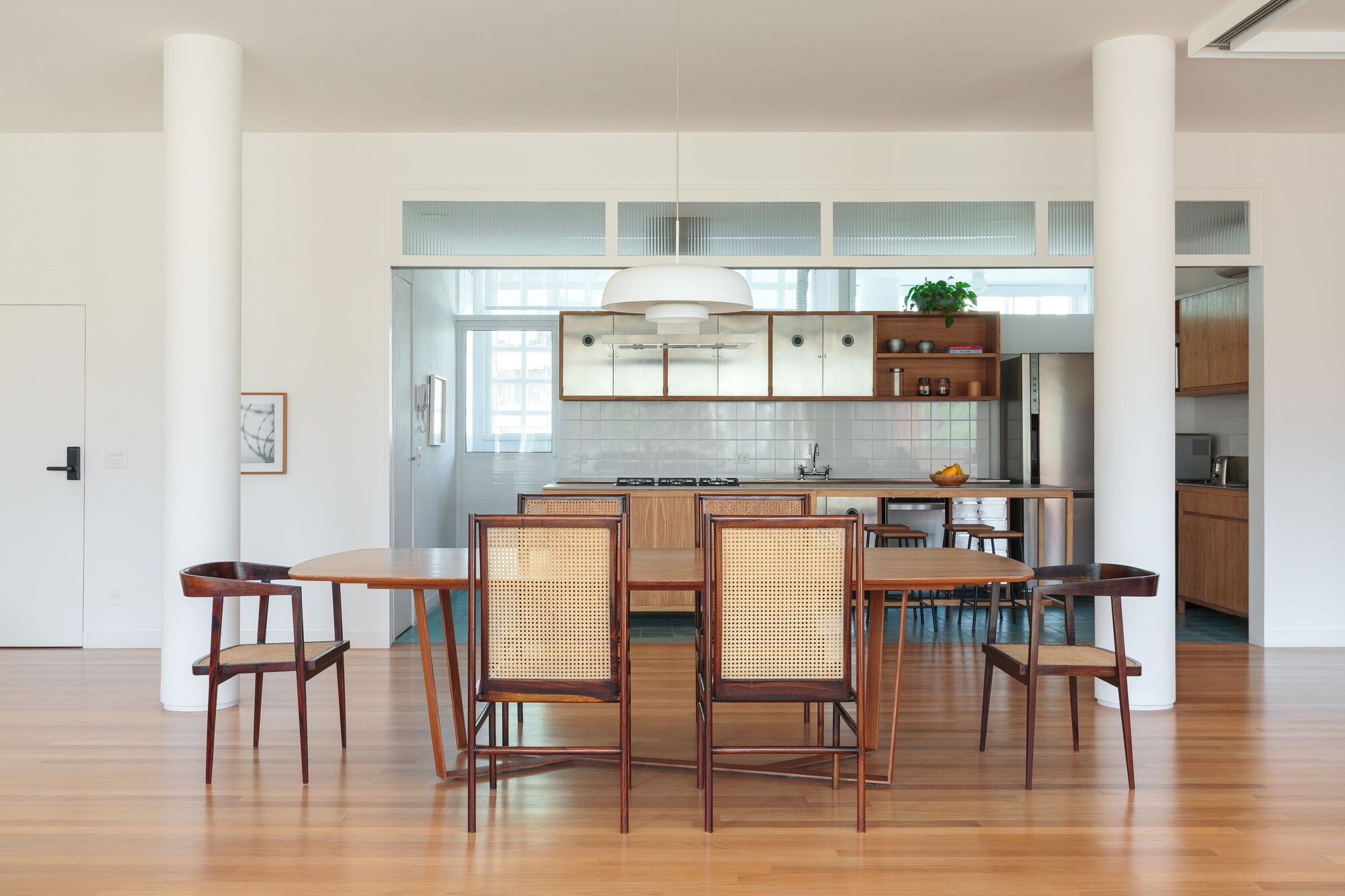 The iconic cobogós and brise-soleils that make up the facade and shape the internal planes through their beautiful play of light and shadow, the prominent round pillars that provide visual rhythm to the apartment, as well as the choice of furniture that reveres and enhances the modernist aesthetic.