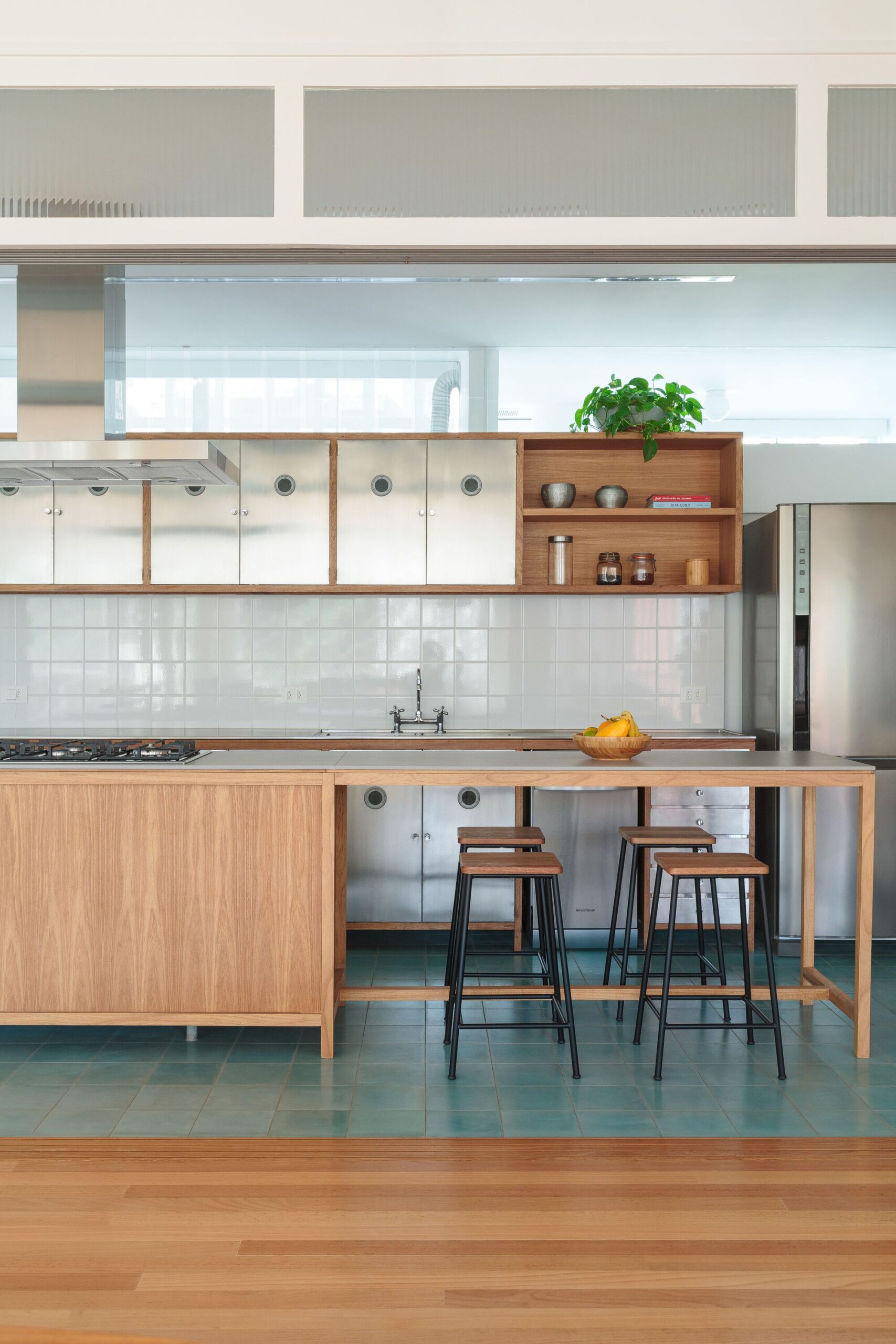 The stainless steel cabinets, original to the time, were refurbished and incorporated into the new kitchen. The upper module, set away from the ceiling, creates space for a glass brise that promotes air circulation and the entry of natural light. The combination of new and old elements was one of the main premises of the project, which aimed to re-signify and keep alive the history and memories of this space.