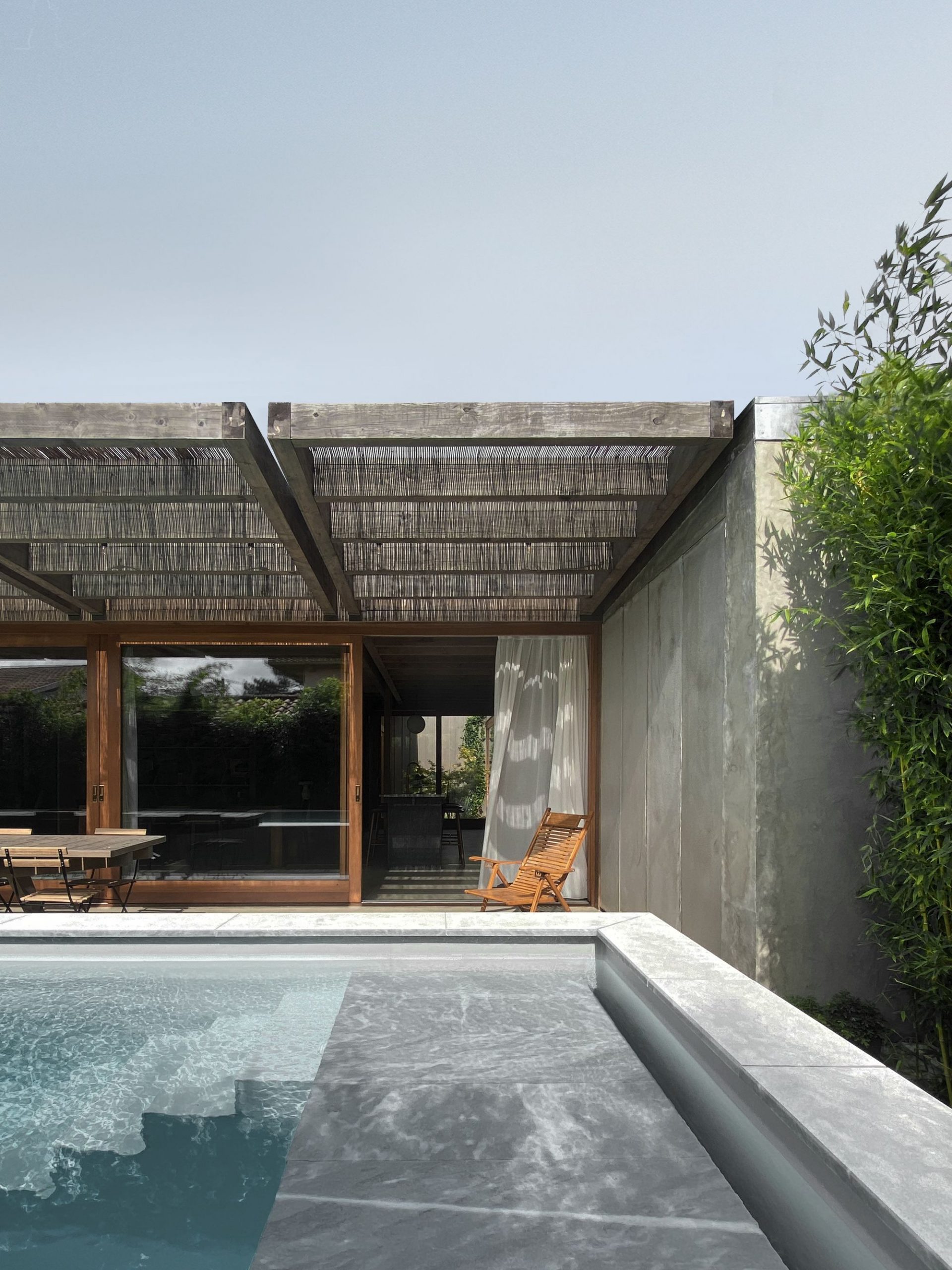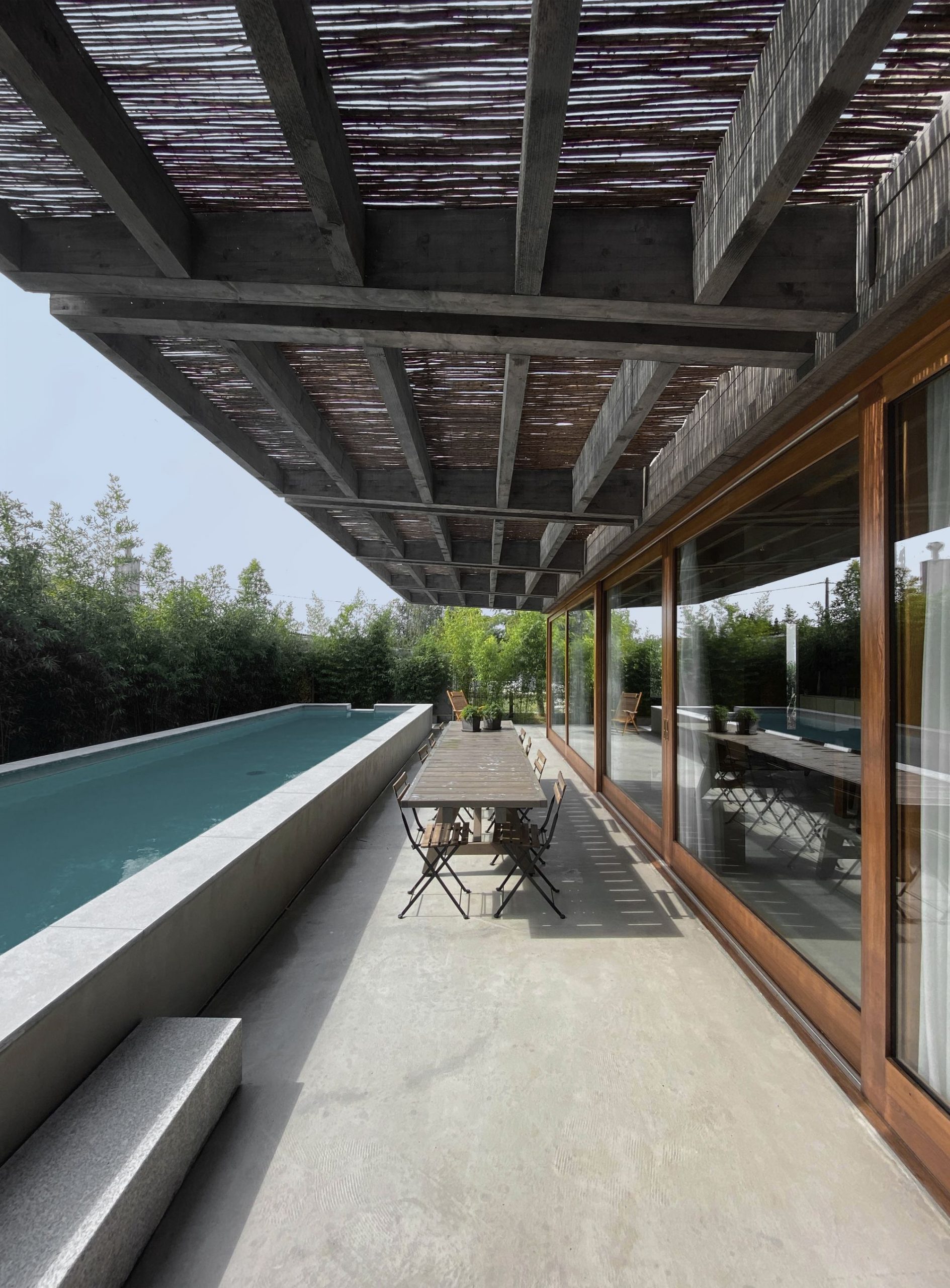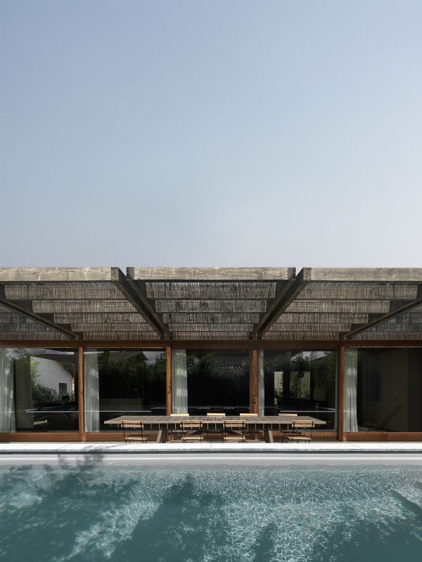 The sleeping rooms are located in the existing construction. A swimming pool runs along the terrace to the south and closes the ground. The materials used are local, simple, raw and assembled in a traditional way.