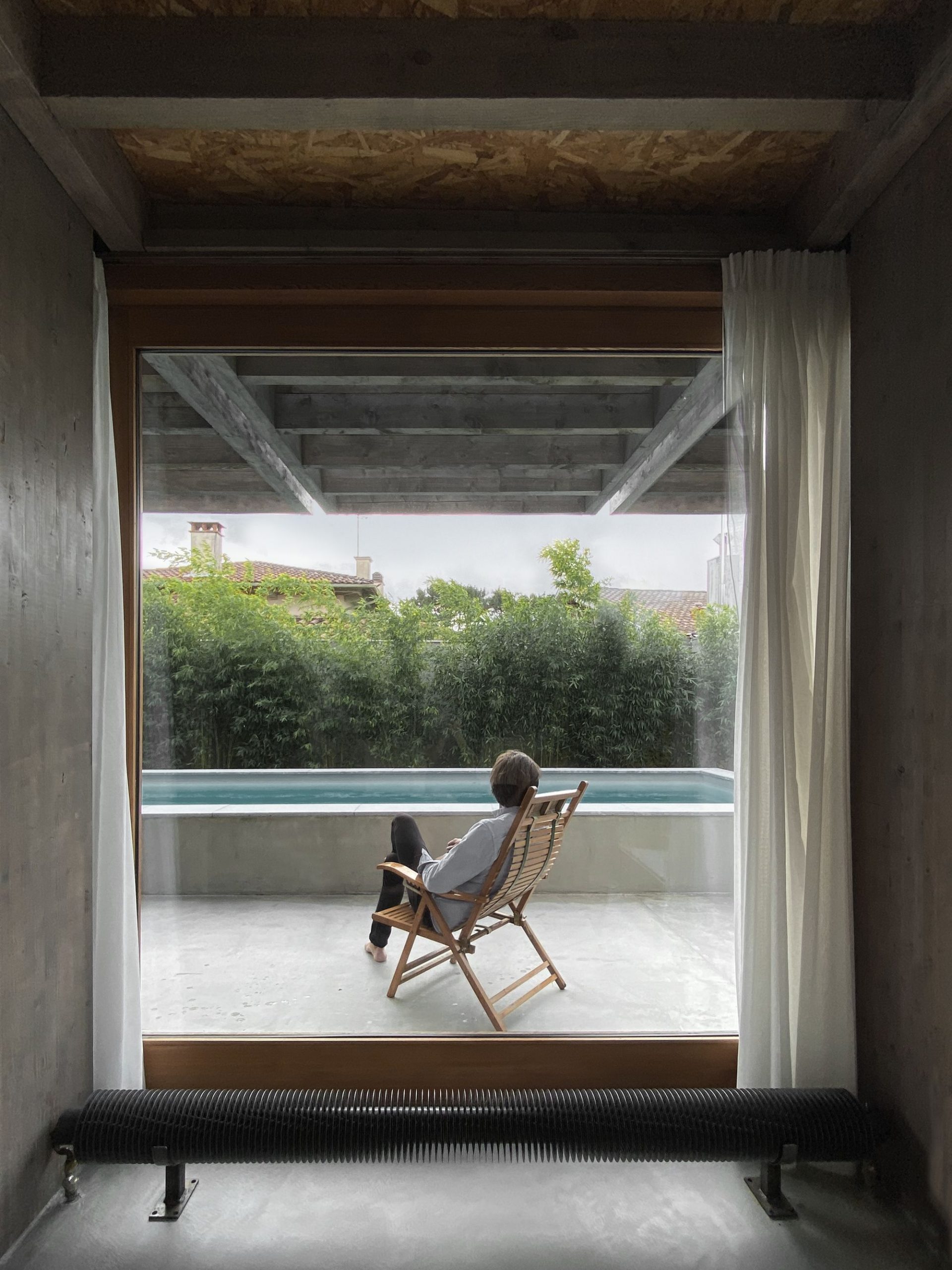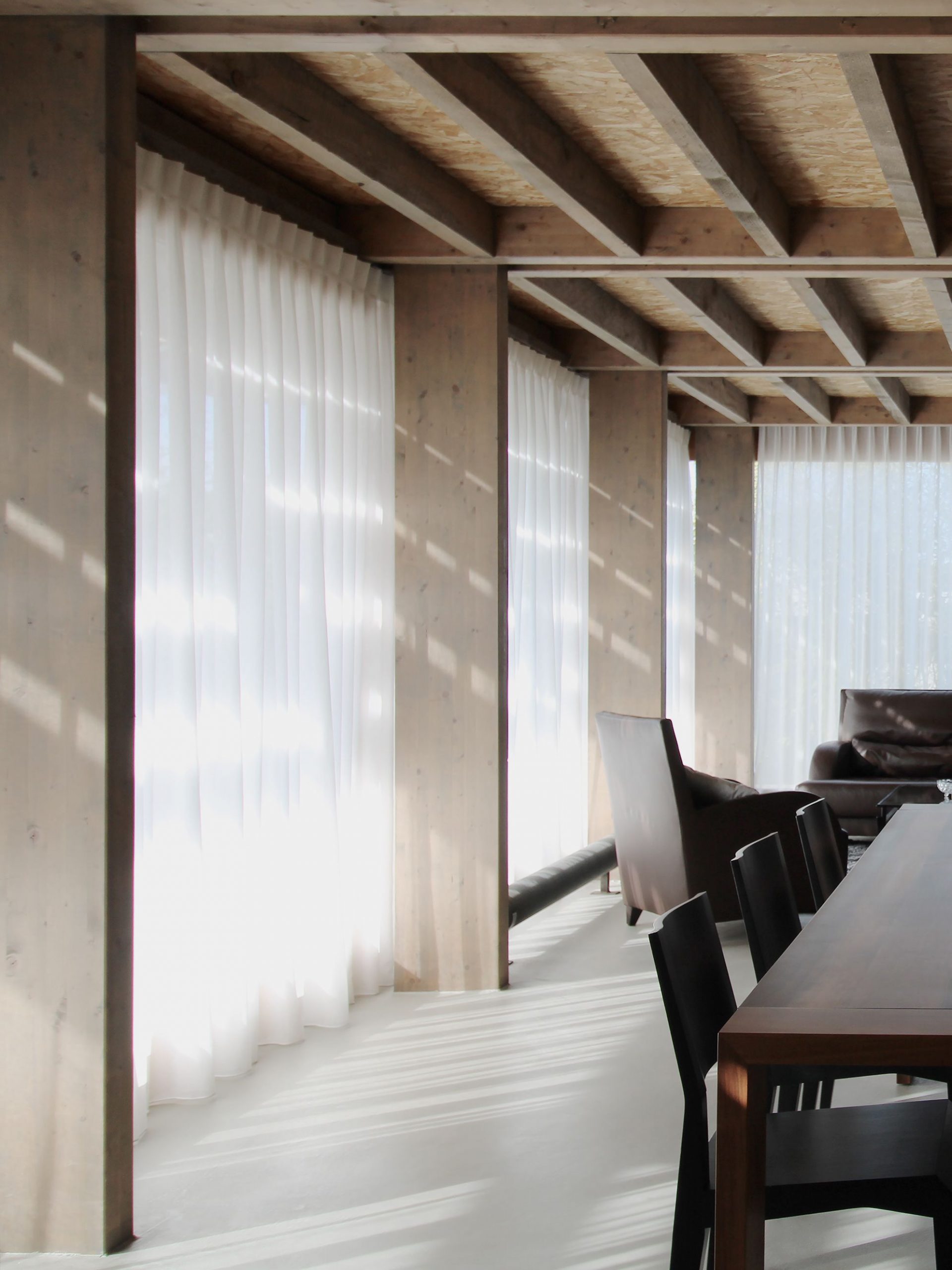 The challenge here was to “hide” the ex-tension as much as possible, leaving only the smallest possible built volume to be seen from the street. The extension built entirely in wood structure and cladding surrounds the existing house to accom-modate the living rooms.