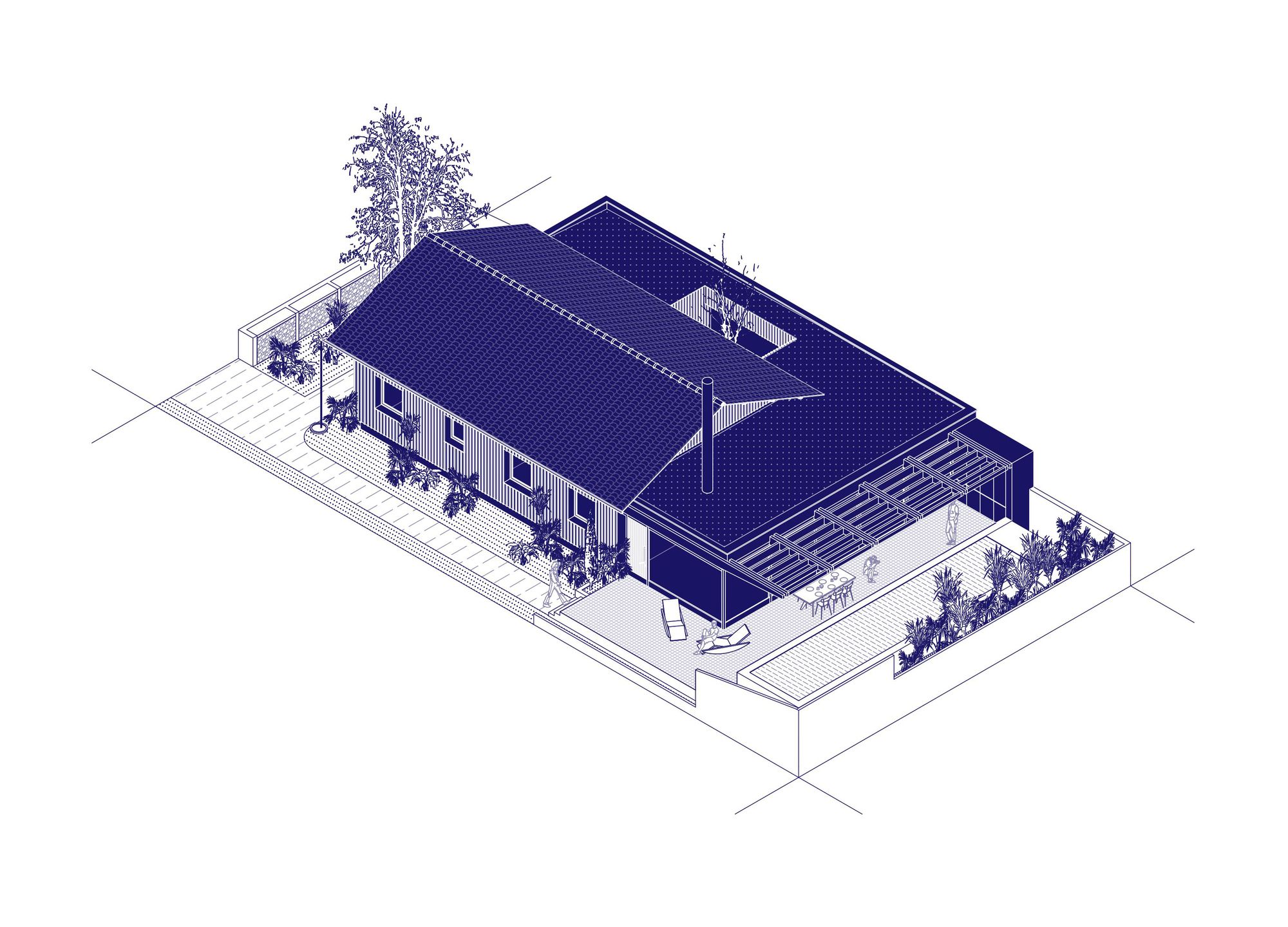 The pavilion placed in its center occupied 70 m2. The project responds to the problems of densification of residential areas typical of the 1970s, where the fabric was very squared and the plots of small surface.