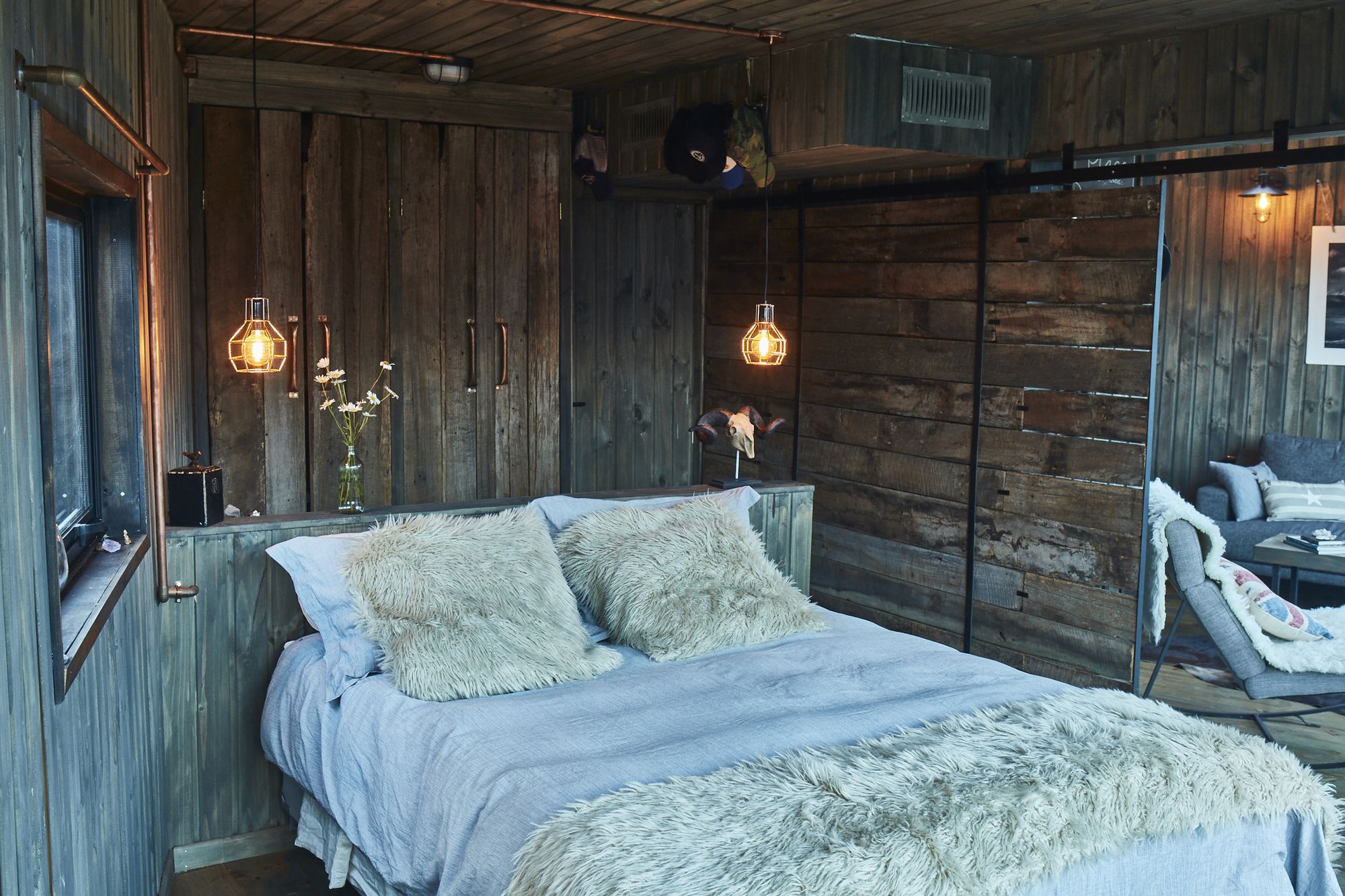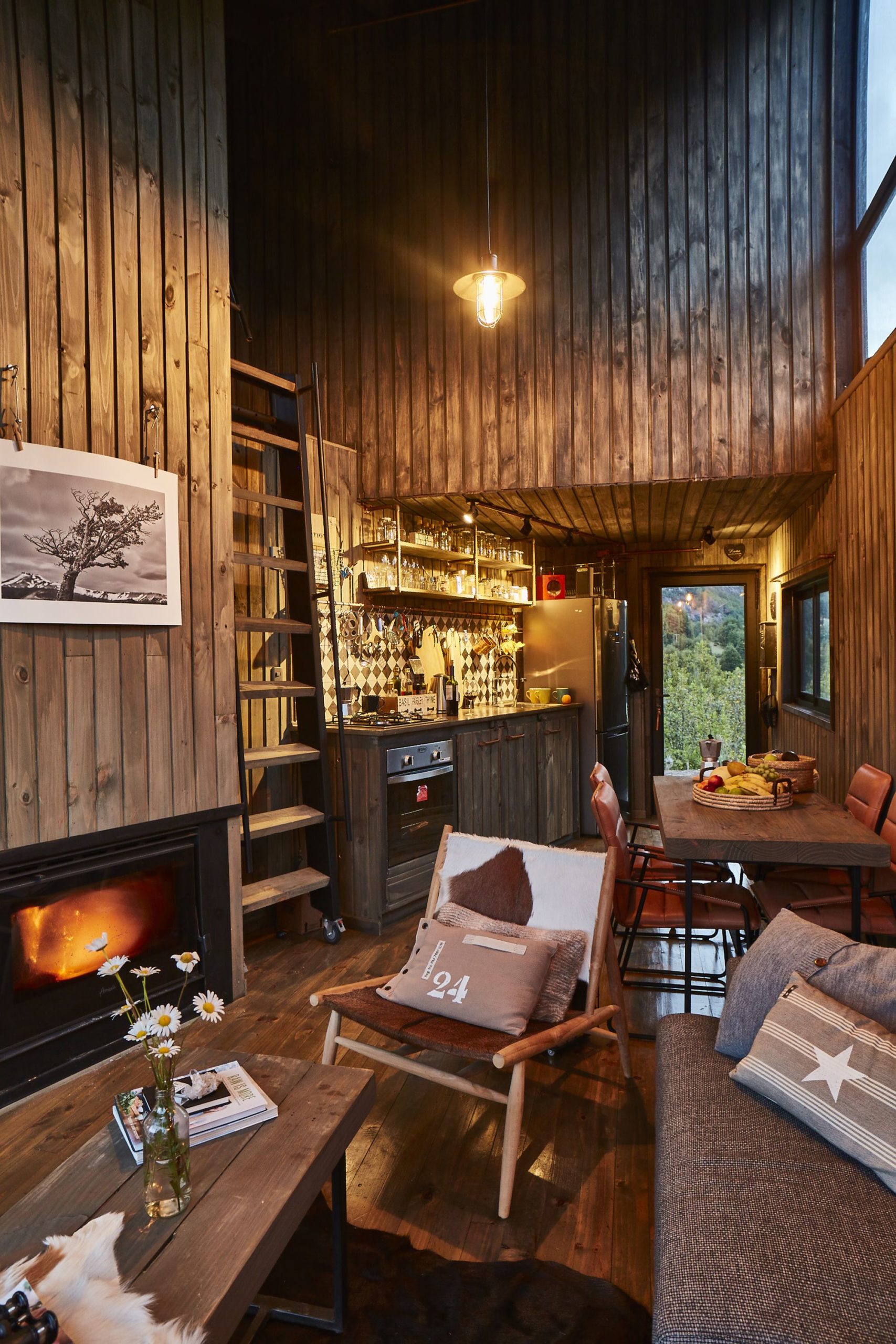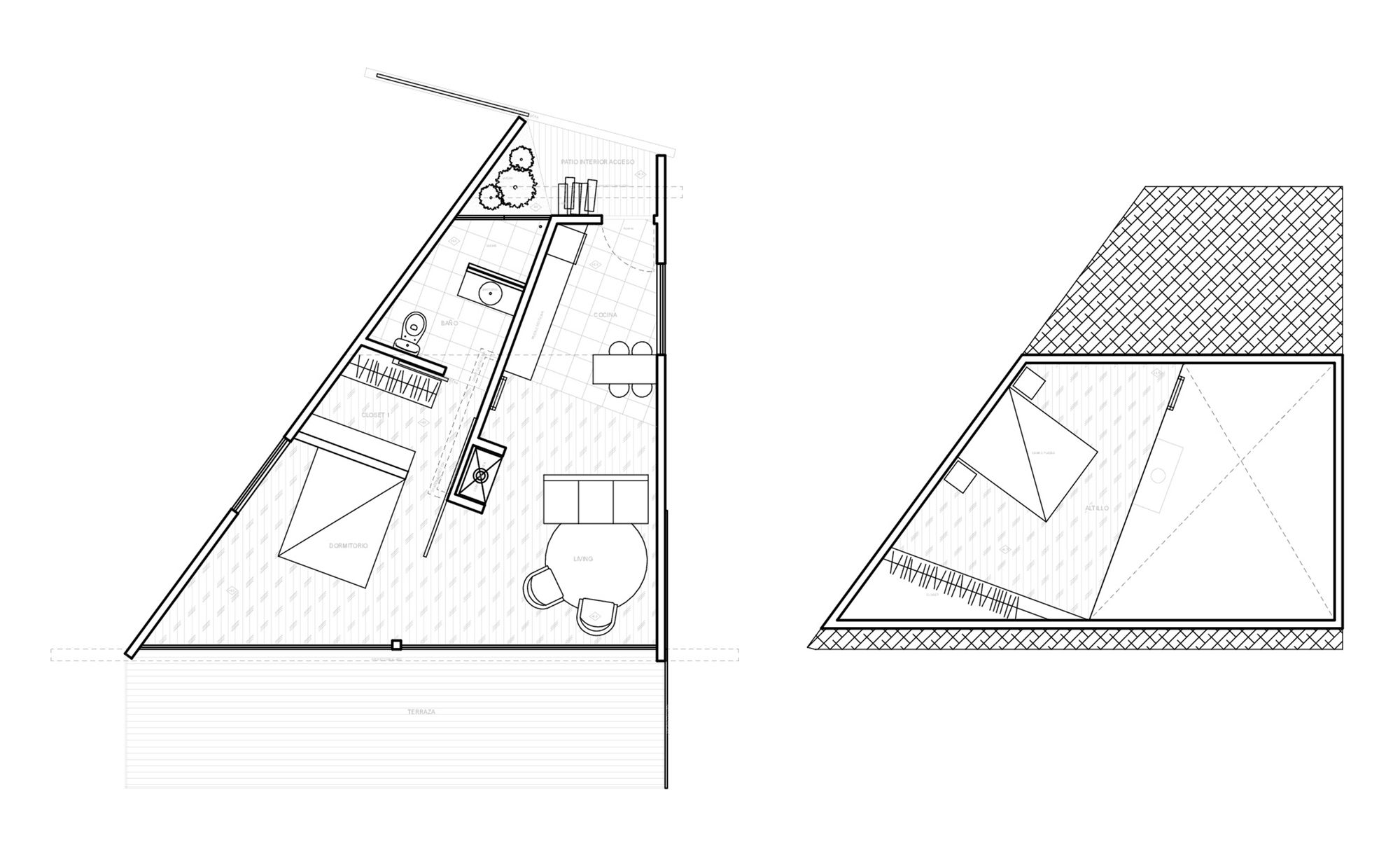 The sloping roofs rise to create a loft, which is accessed through a retractable staircase that frees space in the small dwelling, without disturbing it. Finally, the fireplace of the house is in the middle of the building in order to maintain heat and has a shaft that distributes heat naturally to the bathroom and bedroom.