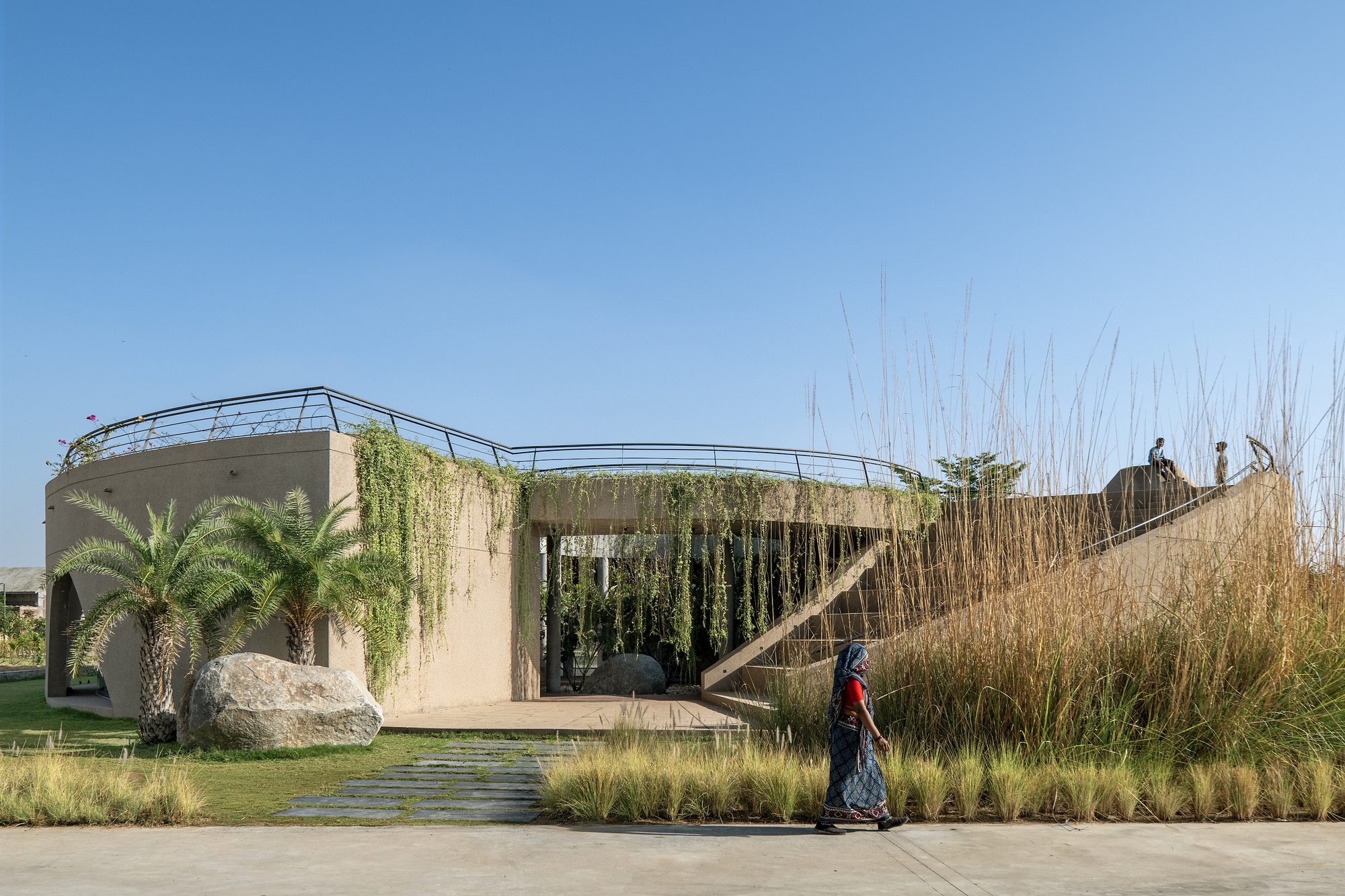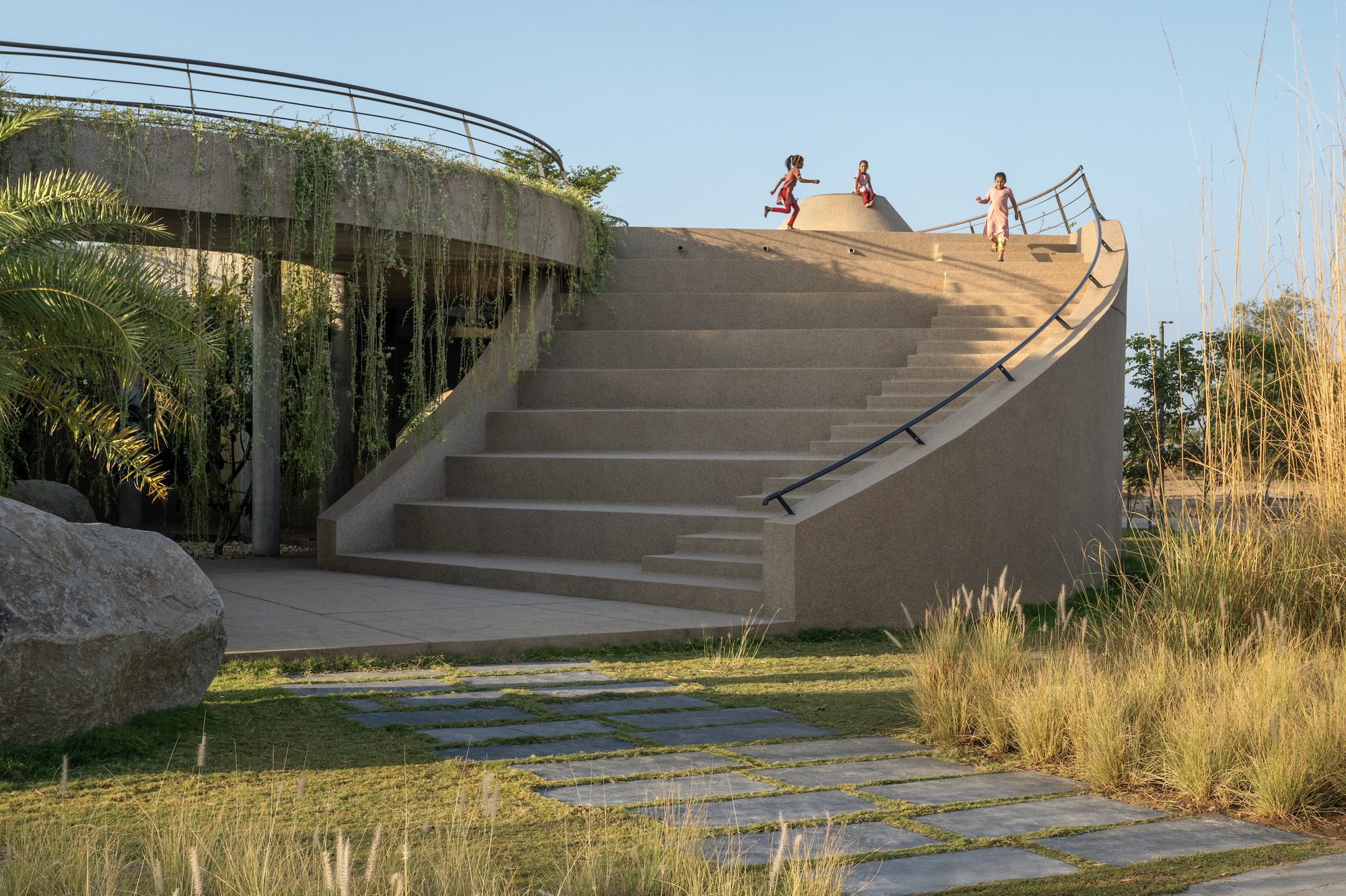 Finally, the micro-elements of the design, such as the shadows cast by the arches, the glass panels, the sky cutouts, and the carefully considered lighting design, contribute to the overall experience of the space. The arches’ shadows create dynamic patterns inside the building, while the glass skin blurs the line between inside and outside. The sky cutouts above the pool and terrace garden enhance the feeling of openness, bringing the sky into the experience of the spaces. Evening lighting around the pool and amphitheatre creates an inviting atmosphere, adding to the sense of tranquillity and beauty throughout the site.