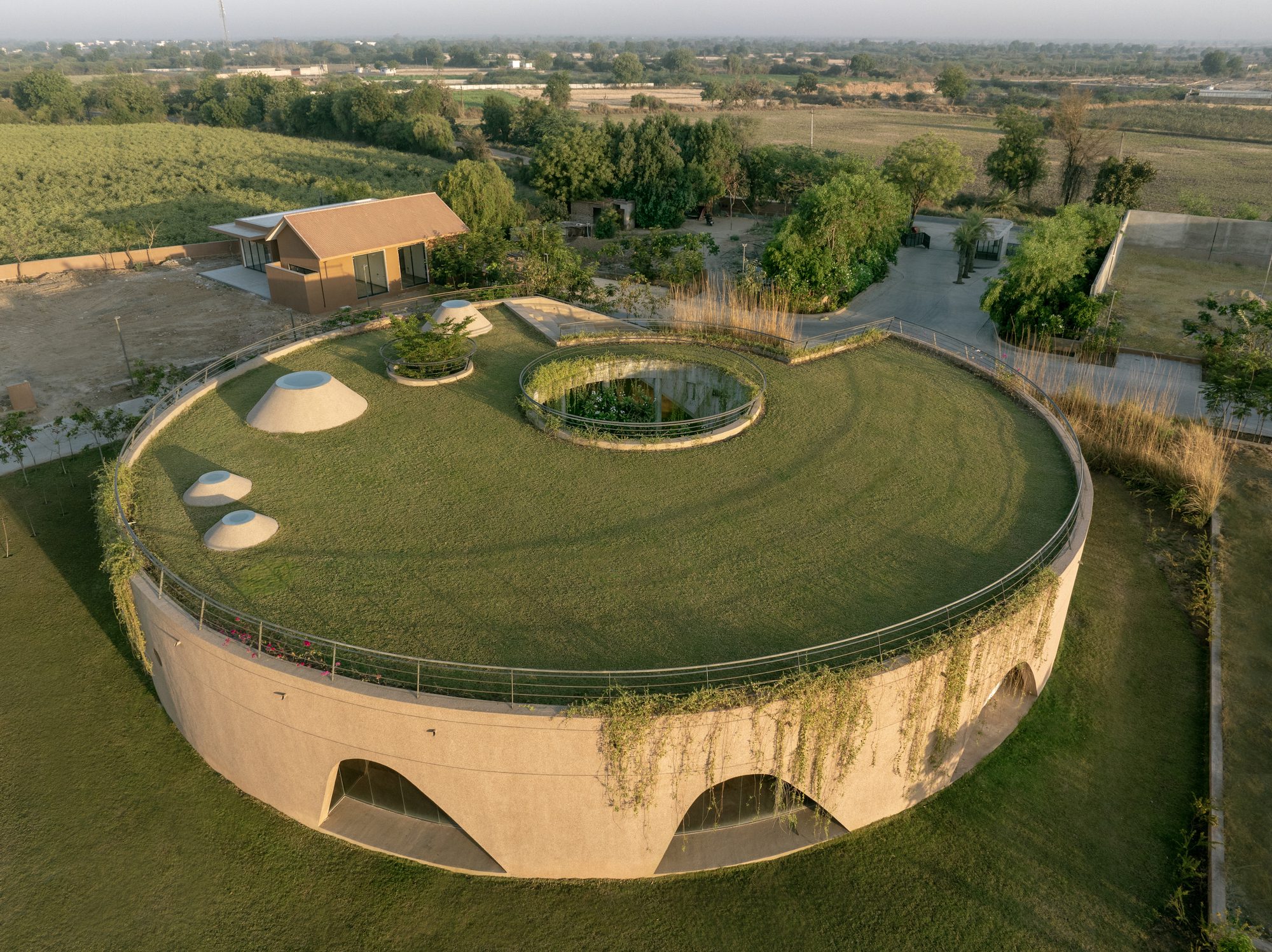 A significant feature of the design is the semi-open swimming pool area, which is integrated into the circular form of the building. The pool is divided into two parts, and its design is enhanced by cutouts in the roof, allowing natural light to filter in and create a sense of openness. The sloping walls surrounding the pool create a dynamic atmosphere, making it an inviting and accessible space. In the evenings, soft lighting around the pool area adds a dramatic effect, further enhancing the experience of the space.