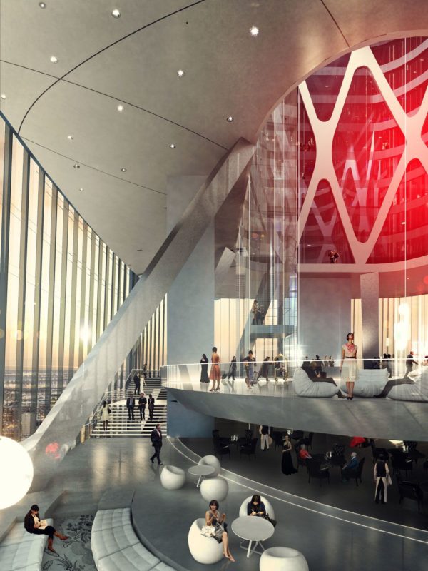 The hotels structure, starting at the lobby at the 72nd floor, up to the 100th is accompanied by a full height atrium in its core. By substituting the concrete walls for steel, the hotel’s interior is able to breathe, as well as provide unobstructed views to the guests. The hotel is, therefore, able to accommodate 46,000 square meters of guest space along with a sky lobby and observatory floor located at the top.