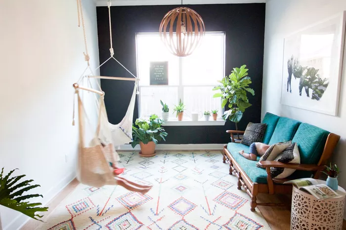 For a bold and fun living room transformation, use a hammock instead of a regular sofa—hammocks can be more comfortable, making the room feel more lively.