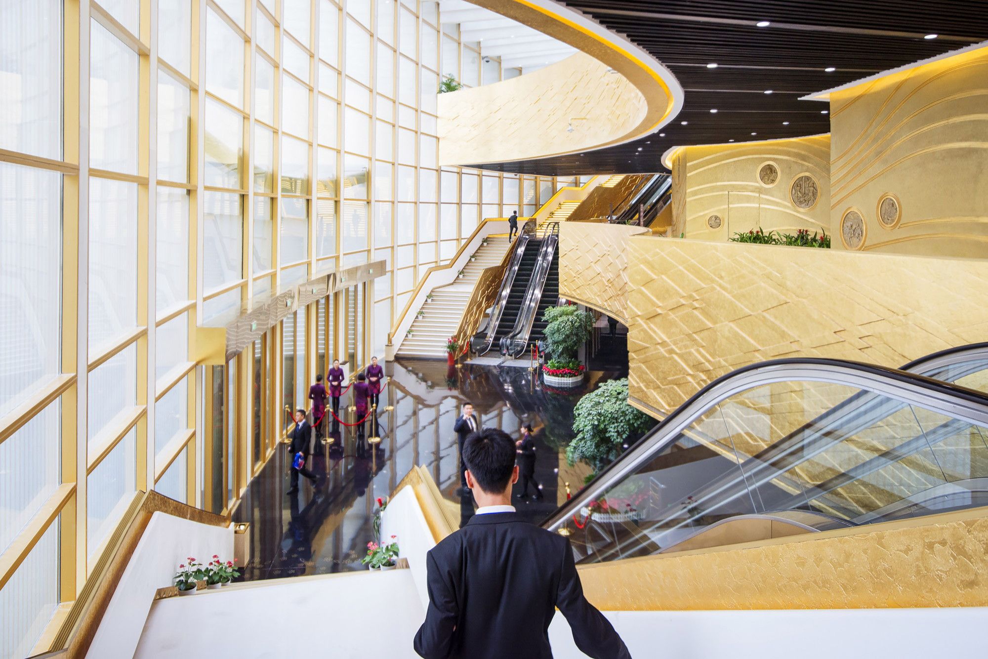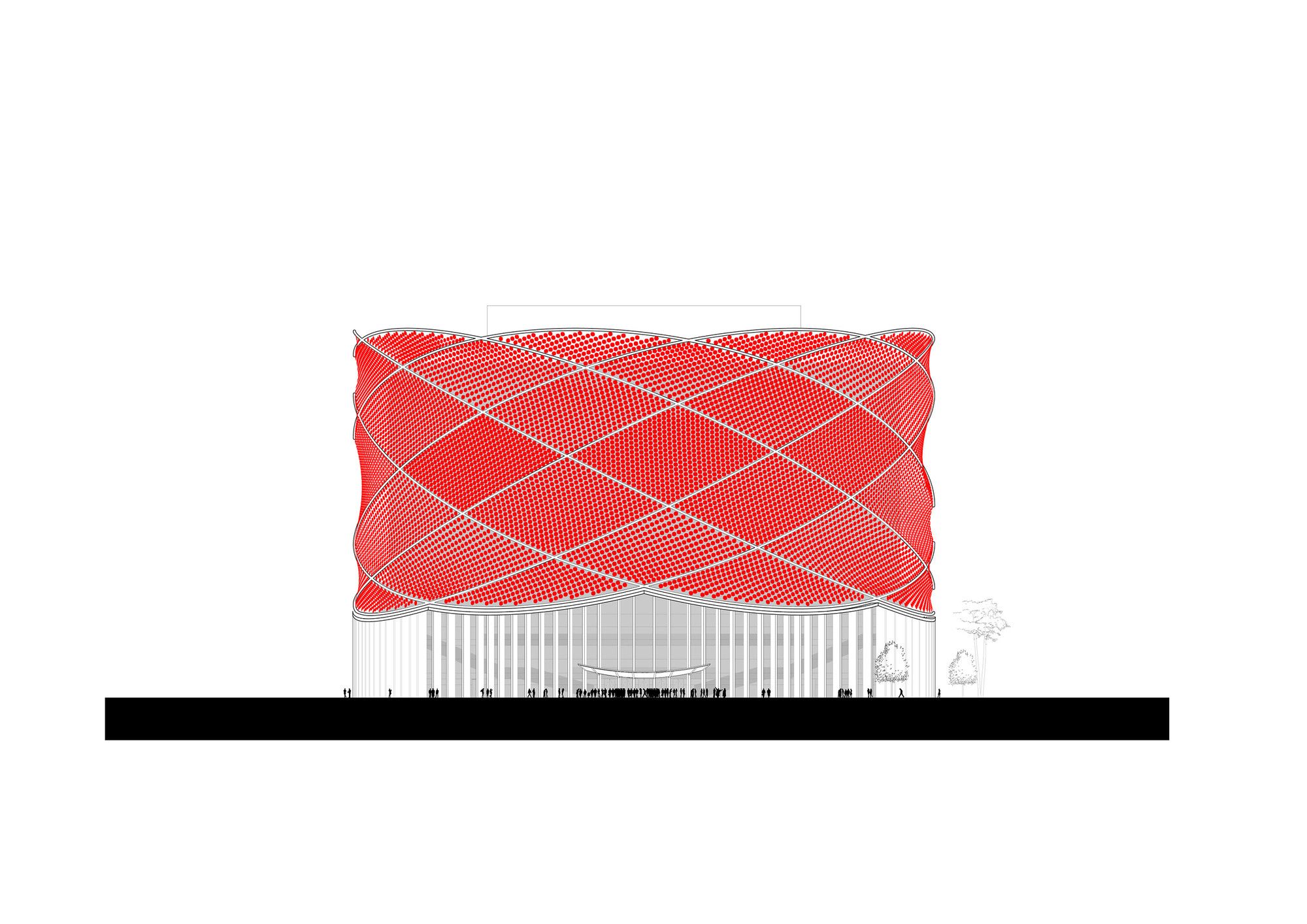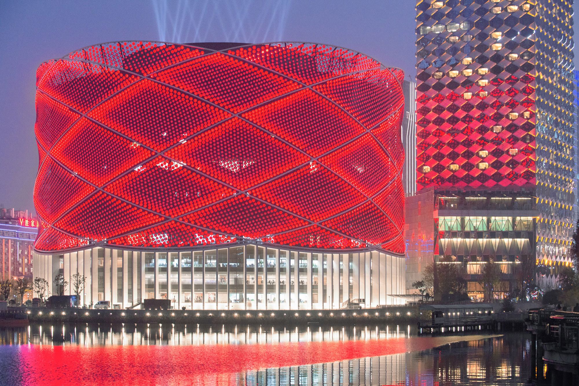 The concept for The Han Show Theatre is derived from the traditional Chinese lantern. Stufish wanted to create an instantly recognizable Chinese symbol that would provide an aesthetic cladding to the theatre’s auditorium and fly tower. The lantern itself is designed to work at many scales. From distant views from across the lake it can be read as a simple symbolic form. Up close the lantern surface is created from thousands of disks each of which is lit both inside and out. Inside the theatre lobby space, the glazed roof of the atrium looks up into the 56m high lantern structure.