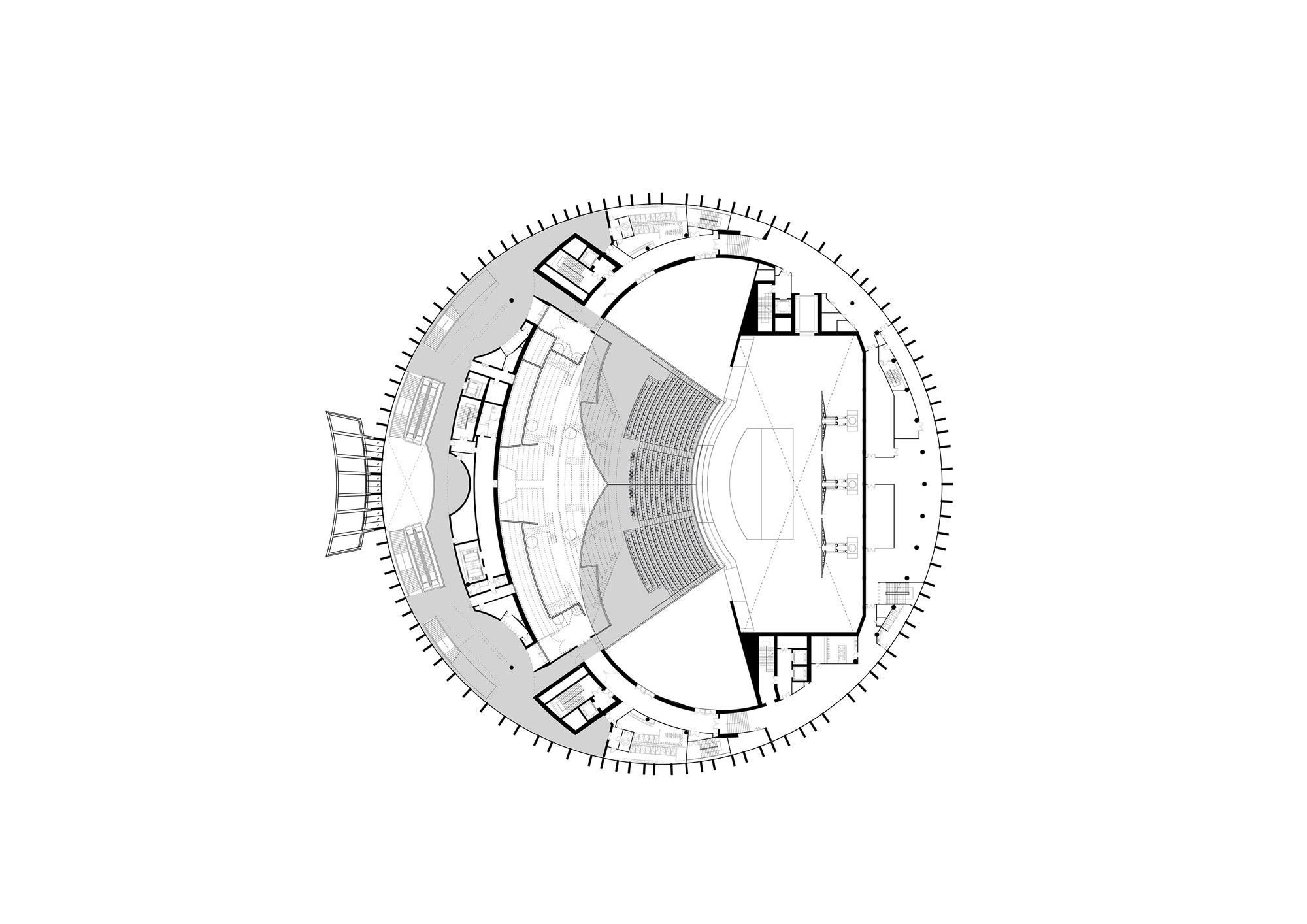 The façade of the theatre is assembled from eight ‘bicycle’ wheels with hundreds of spokes that connect it to the main drum of the theatre. The wheels support a mesh with 25,000 steel disks – the detailing of which was inspired by the Chinese bi disks – an historic Chinese object symbolizing skyward ambition and the heavens – an external symbol of what the audience will discover in Franco Dragone’s show.