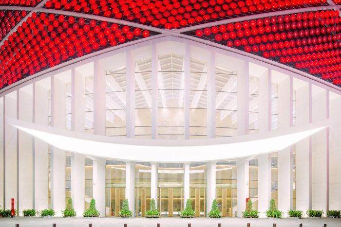The concept for The Han Show Theatre is derived from the traditional Chinese lantern. Stufish wanted to create an instantly recognizable Chinese symbol that would provide an aesthetic cladding to the theatre’s auditorium and fly tower. The lantern itself is designed to work at many scales. From distant views from across the lake it can be read as a simple symbolic form. Up close the lantern surface is created from thousands of disks each of which is lit both inside and out. Inside the theatre lobby space, the glazed roof of the atrium looks up into the 56m high lantern structure.