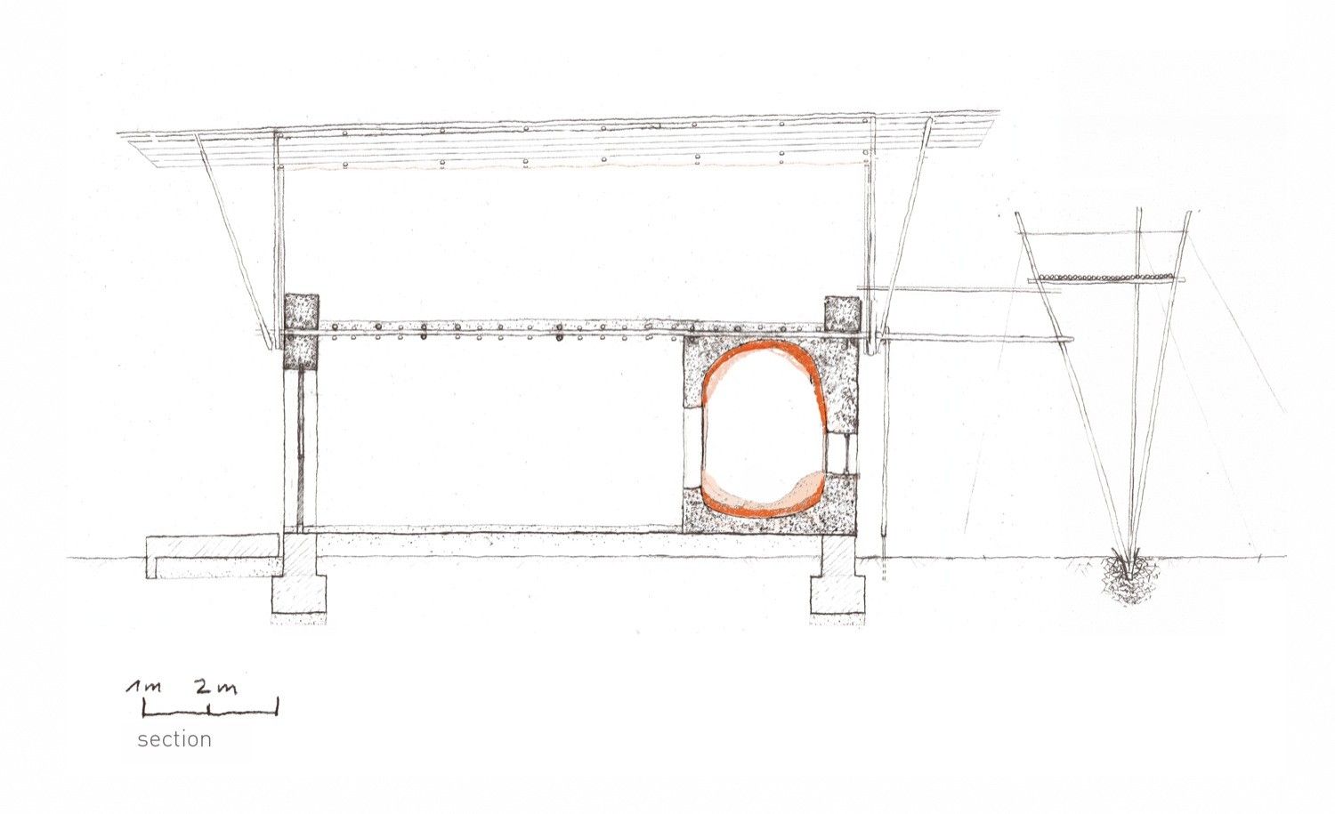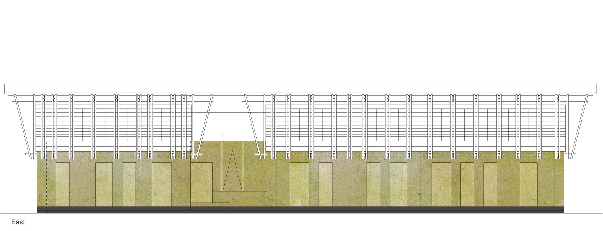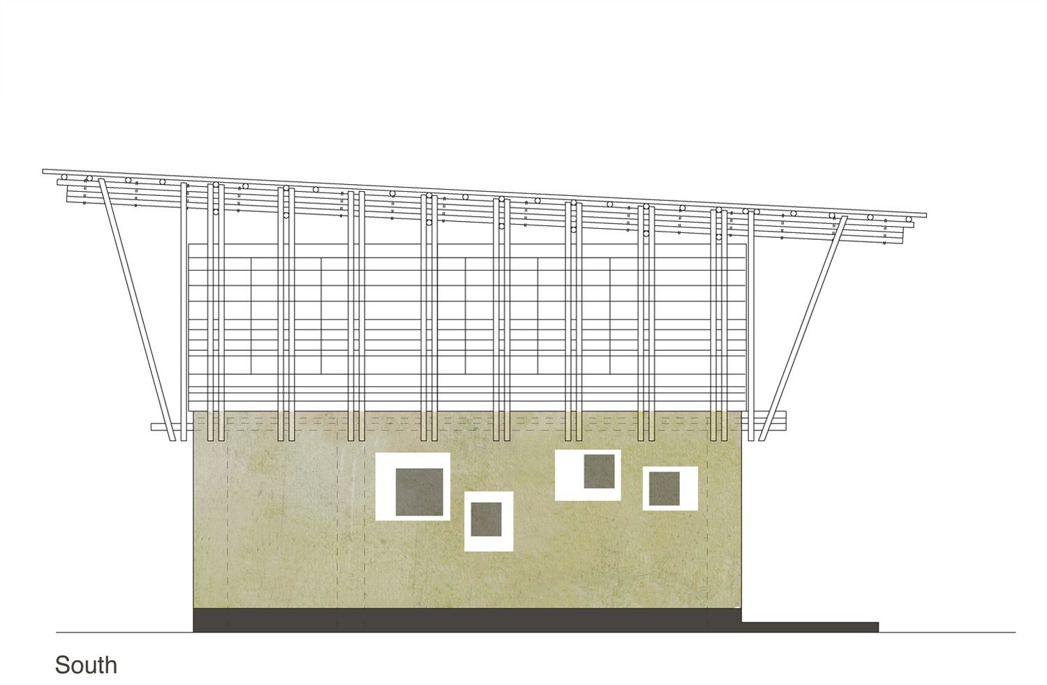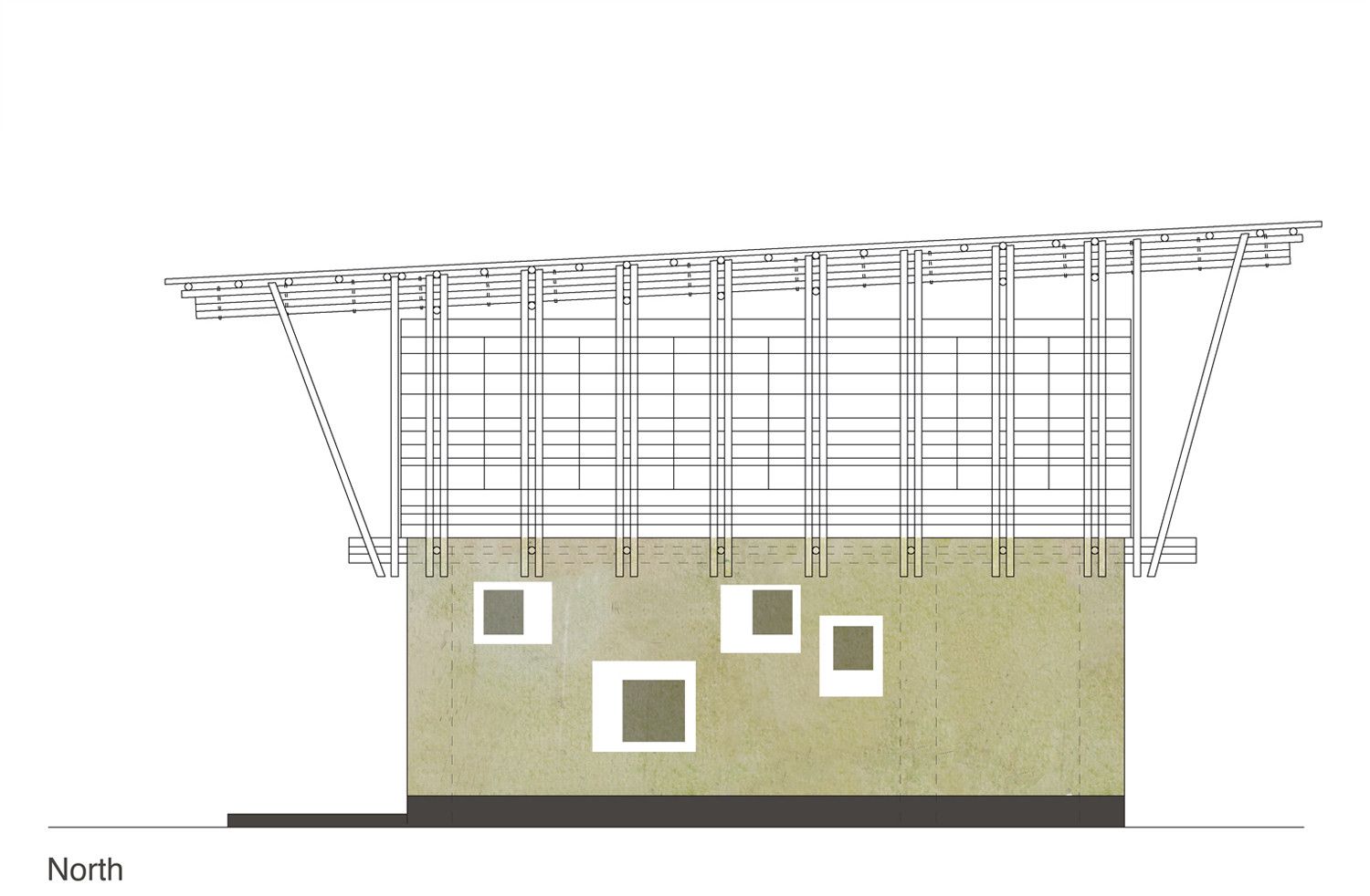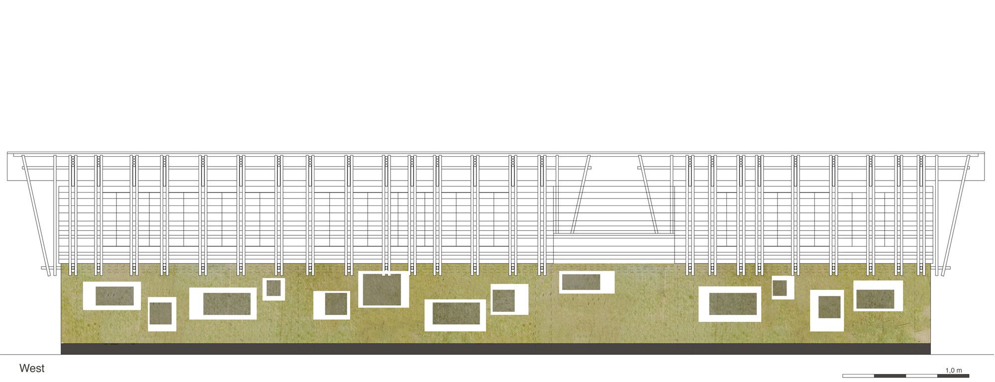 The upper story is a frame construction of four-layer bamboo beams and vertical and diagonal members arranged at right angles to the building. The end of the frames at the short ends of the building and the stair also serve to stiffen the building. These are connected via additional structural members with the upper and lower sides of the main beams and equipped with additional wind bracing on the upper surface of the frame. A series of bamboo rafters at half the interval of the frame construction beneath provide support for the corrugated iron roof construction and are covered with timber paneling and adjusted in height to provide sufficient run-off.