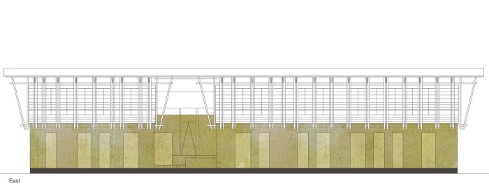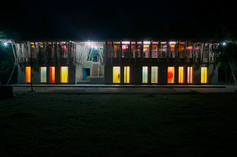 Finishes and fittings: The exterior surface of the earth walls remains visible and the window jambs are rendered with a lime plaster. The framework construction of the green façade to the rear is made of bamboo canes seated in footings made of old good pipe and with split horizontal timbers as latticework. The interior surfaces are plastered with a clay paster and painted with a lime-based paint. The ‘caves are made of a straw-earth daub applied to a supporting structure of bamboo canes and plastered with a red earth plaster. The upper story façades are clad with window frames covered with bamboo strips and coupling elements hung onto the columns of the frame construction. The fifth layer of cob walling provides a parapet around the upper story forming a bench running around the perimeter of the building and anchoring the upper story frame construction and roof against the wind from beneath. A textile ceiling is hung beneath the roof is lit from behind in the evening. The cavity behind the textiles ventilates the roof space.