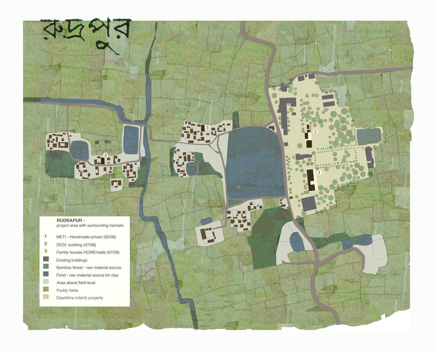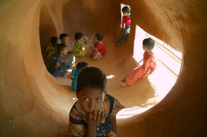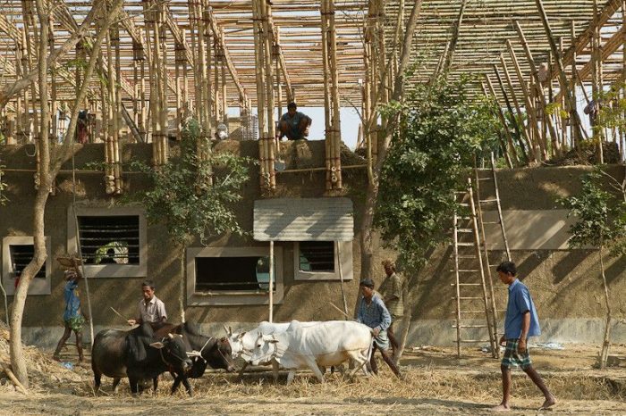 Handmade School designed by Anna Heringer & Eike Roswag, Context: Bangladesh is a fertile alluvial land in the Gulf of Bengal and the land with the highest population density in the world. On average nearly 1000 people live in every square kilometer and over 80% of the population live in rural areas. Much of the vernacular built tradition uses earth and bamboo as a building material, however, construction techniques are error-prone and many buildings lack foundations and damp proof coursing. Such buildings require regular maintenance, are often prone to damage and last on average only 10 years.