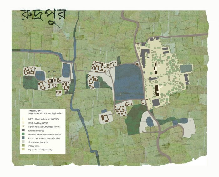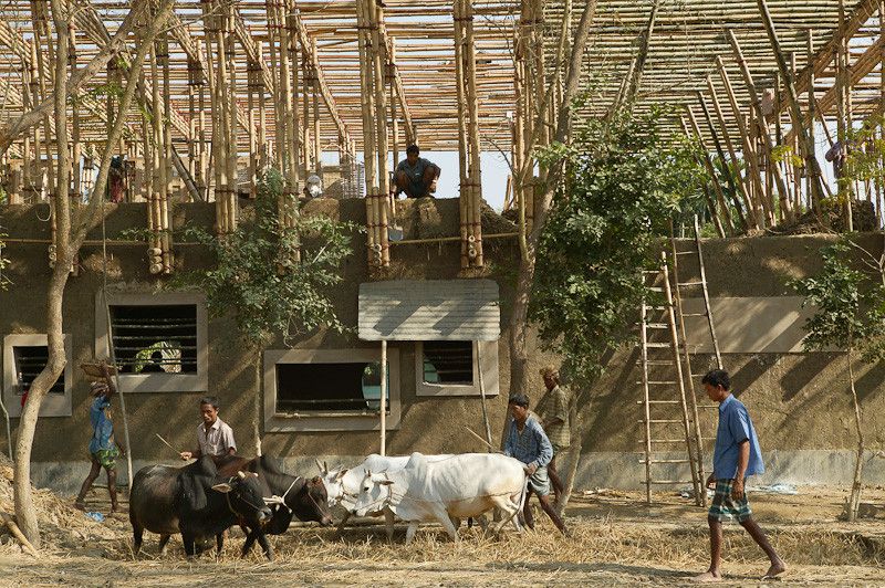 On-site labor using and training the local workforce: The masonry foundation was constructed by a company from the regional capital Dinajpur around 20km from Rudrapur. The earth building works and bamboo construction was undertaken by local laborers. The building techniques were implemented and developed on the job together with architects and tradesmen from Germany and Austria. 25 local tradesmen from the vicinity were trained during the building works creating new jobs and providing professional “help for self-help”.