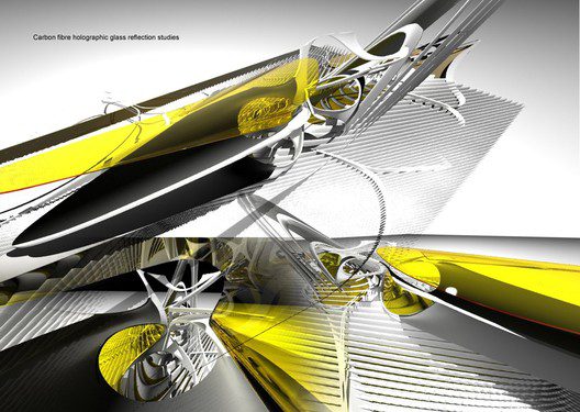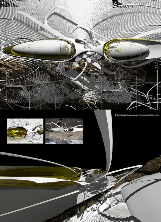 This hi tech prism louver system almost completely reflects direct incident light, but admits diffuse zenith light. The dismountable concave reflection louvers wrap themselves round the pods acting as partly a shading system, they also heighten the experience and the view, a filter that allows to choreograph the view as it is in all its reality but whereby mirages and misleading illusions, at these altitudes, are controlled and edited by these pods creating clear and real images of the immediate environment, alternatively, the pods choreograph a heightened yet dislocated relationship with the real perception of existing views, an alternate reality by using the prismatic optical elements which divide colour with changing viewing points.