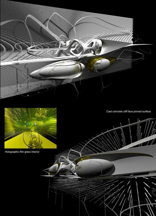 The surfaces are partly embedded partly protruding from the existing rock face structure. A grid of borehole foundations injected into the rock face expand into the existing granite, clamping the main body of the structure into the façade. The hanging hotel creates a serious of polarised glass spaces which protect the climber from glare reflecting light in an uniform direction creating an illusion that the sun is in a lower position than it is and therefore negating glare, Uvb light rays are reduced by using holographic filtered compound glass, this reduces the number and types of wavelengths entering the spaces which in turn reduces the harmful uVb rays, the holographic filters split the white light with a prism affect, the filters are removable and this effect can be taken advantage of.”]