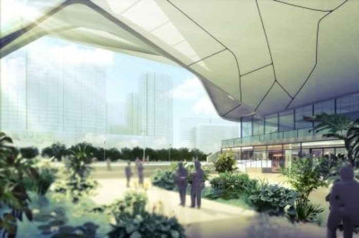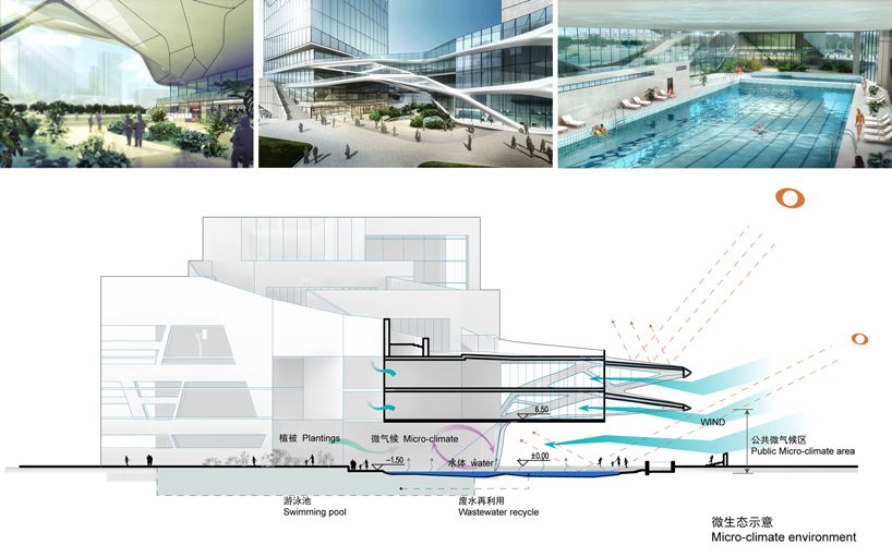 The sunken plaza is 1.5 meters underground, which connects with the entry square by folding shaped steps, becoming a big open space designed as a microclimate ecological environment. The cantilevered plaza roof and canopies offer the sunken area shade while the plant-life and water features cool the air underneath through natural convection and evaporative cooling. This area contains public amenities such as gift shops, bookstores, and cafés, and also interacts with the swimming pool behind the curtain wall on the first floor of the complex, creating a lively water environment. All the swimming pools are contained within a grand open space and can be entered from the south façade or from the civic square.
