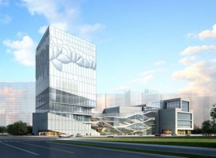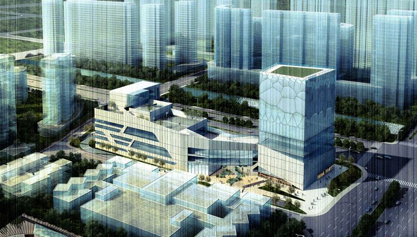 The main tower and podium is wrapped with three folding pieces covered with cellular aluminum. The twisted-folding shape has a dynamic trend of an upward spiral that also determines the density of the skin texture. Faceted crystalline geometry with crystal patterns in 3D cold lamination film, ETFE membrane, and honeycomb glass structure, heighten the sense of irresolution between flatness and depth as well as correlate graphic or pattern effects with mass inflections. The design features massive membrane bubble windows orientated to allow views out to all angles of the city. The perforated stainless steel panel on the wall strengthens the crystal shape, making this building an iconic attraction landmark for the city.