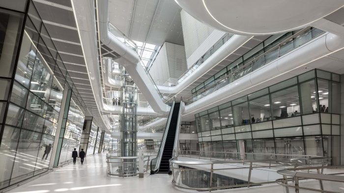 The architectural vision was to create a sleek, contemporary and mysterious building with a floating silver roof. Analysis of their existing facilities provided an insight into the testing spaces, which ranged in their requirements from isolation pits to double-height spaces to accommodate specialist equipment. The building’s section was key to resolving this complex spatial puzzle. The building has a dynamic, integrated plan that promotes visual connections between different areas, and the arrangement is highly flexible to enable future changes in use. In profile, the levels step up from four to six stories, in response to the height restriction imposed by an adjacent government site.