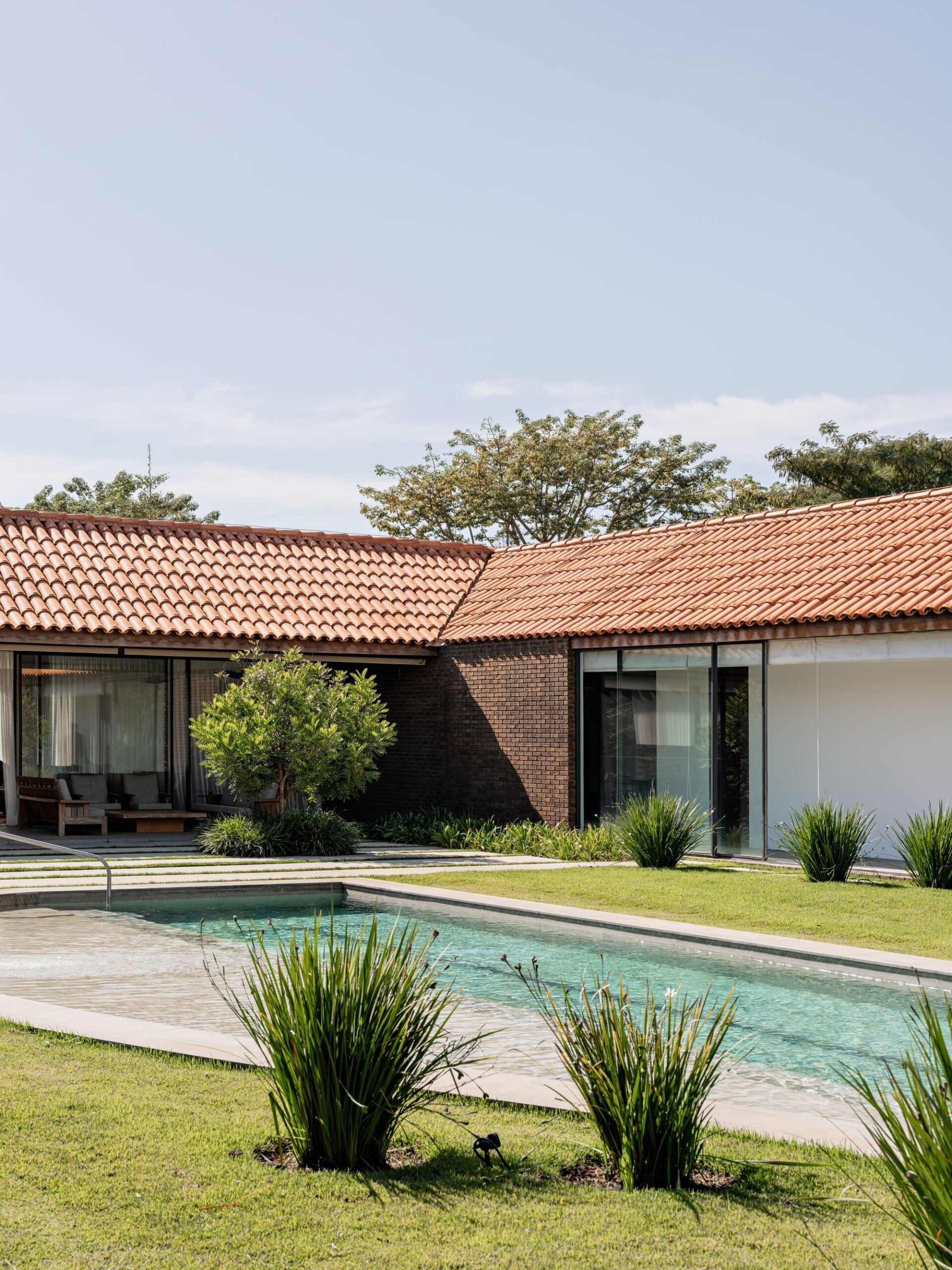 Haras House is a single-story residence built on a trapezoidal lot. The “C” shaped volume organizes the spaces around a central courtyard, which features a garden, a porch, and a 25-meter lane, integrated into the resident’s daily routine. The design prioritizes privacy and the direct relationship between internal and external spaces.