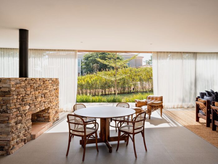 The program is distributed across three well-defined wings. The private wing contains five suites, with the main suite positioned at the end, offering openings in two directions and views of the courtyard and the side setback. On the opposite side, the service wing accommodates a garage, a support apartment, a laundry room, and a kitchen. Between the two blocks, the social area connects the volumes with a living room, dining room, and central fireplace, in addition to a spacious porch that integrates the indoor spaces with the outdoor pool area.