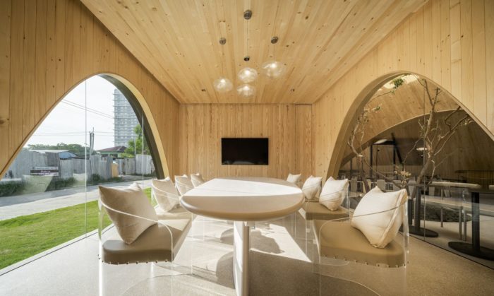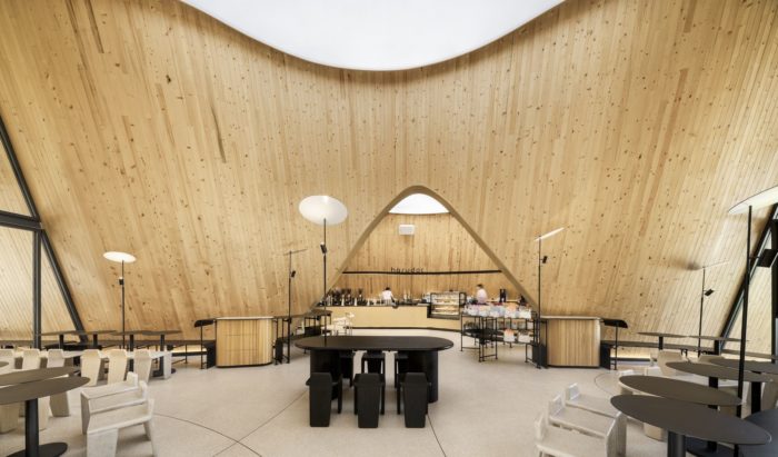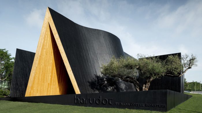 The café brand’s identity is heavily influenced by Japanese culture, and this influence strongly impacts the design approach. The architect interpreted this influence as representing humble simplicity while paying close attention to detail. This concept is reflected in the exterior design, where three simple gable forms in black color create a subdued aesthetic that contrasts with the natural warmth of the pine wood walls within the interior space of Harudot. As visitors enter the café through the roof, they encounter a space that gradually curves and transitions, leading them deeper into the café. Here, the environment becomes more dynamic and leaves a lasting impression on guests.