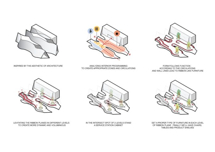 Harudot’s seating arrangement creates a seamless ribbon-like flow around the interior space, establishing a sense of continuity. The counters vary in height to cater to different functions and purposes. The café’s outdoor seating, made from resin, coffee grounds, rice, and leaves, perfectly complements the coffee-themed ambiance.