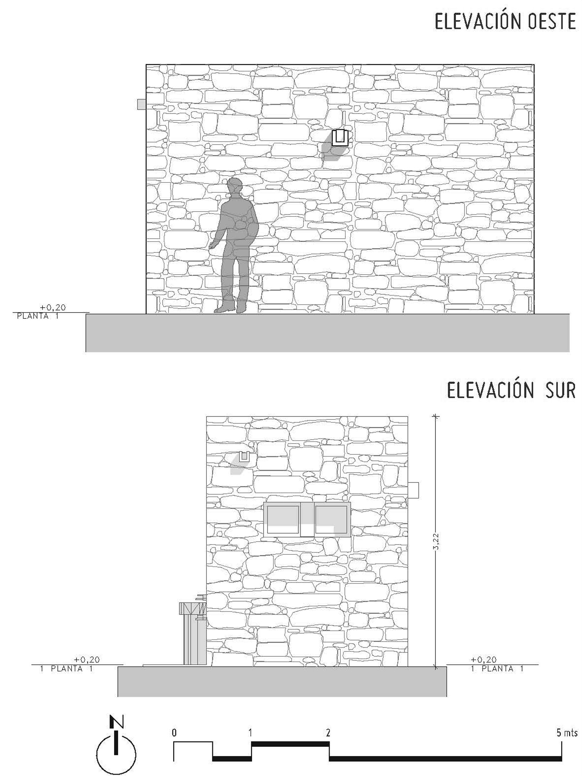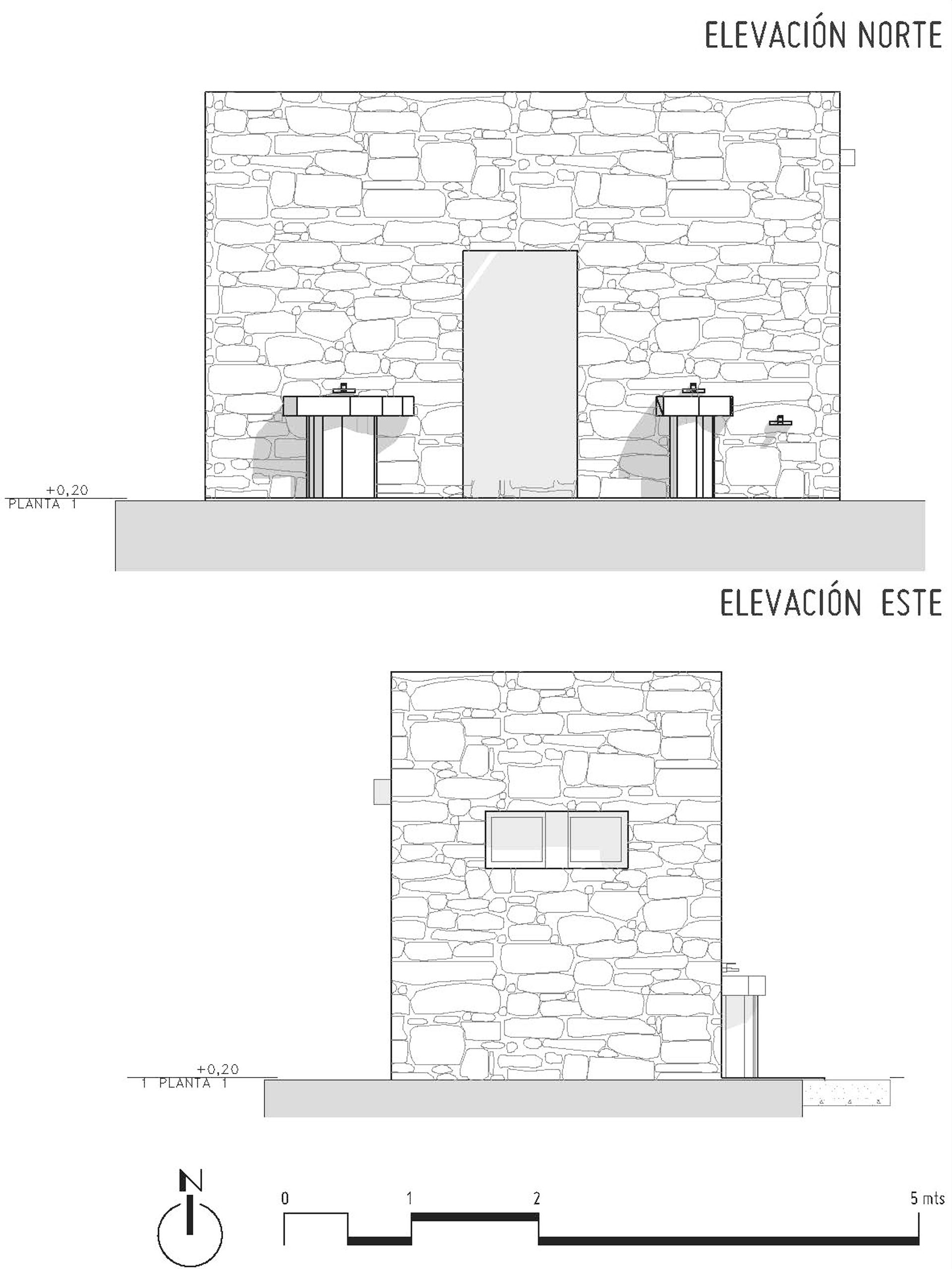 The bathrooms were designed using fixtures made of local pink stone, including two suspended stone sinks, rustic bronze faucets, natural pine doors, and concrete floors to properly seal water flow in the showers and facilitate cleaning. The orientation and opening of the entrances were organized according to the times of greatest module use, appropriately responding to water use during low temperatures. Additionally, entrances were shielded from prevailing winds.