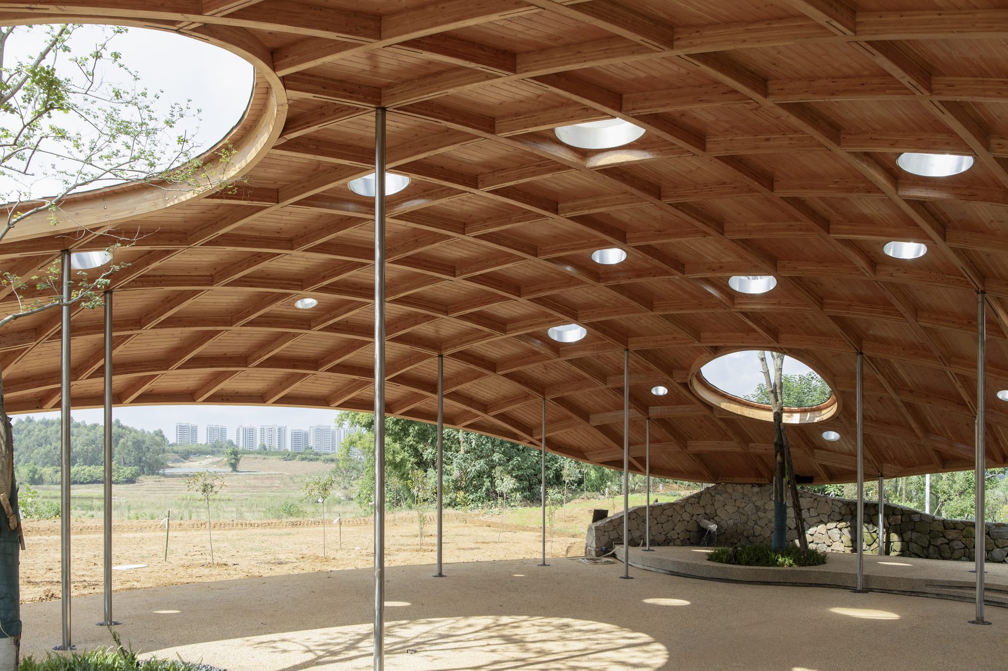The building engages in a dialogue with nature, nestled against the semi-slope, woods, and lake views. The sheltered feeling under the dome, the trees growing through the skylights, and the light filtering between the columns collectively weave a flowing symphony with the environment. It is inclusive and open, adaptable to various activities such as concerts, performances, and casual chats, while also preserving quiet corners for meditation. Through rational technical means embedded in the site, the architecture does not dominate nature but reflects an attitude of harmonious coexistence, granting the environment a unique sense of identity and resonating with its surroundings.
