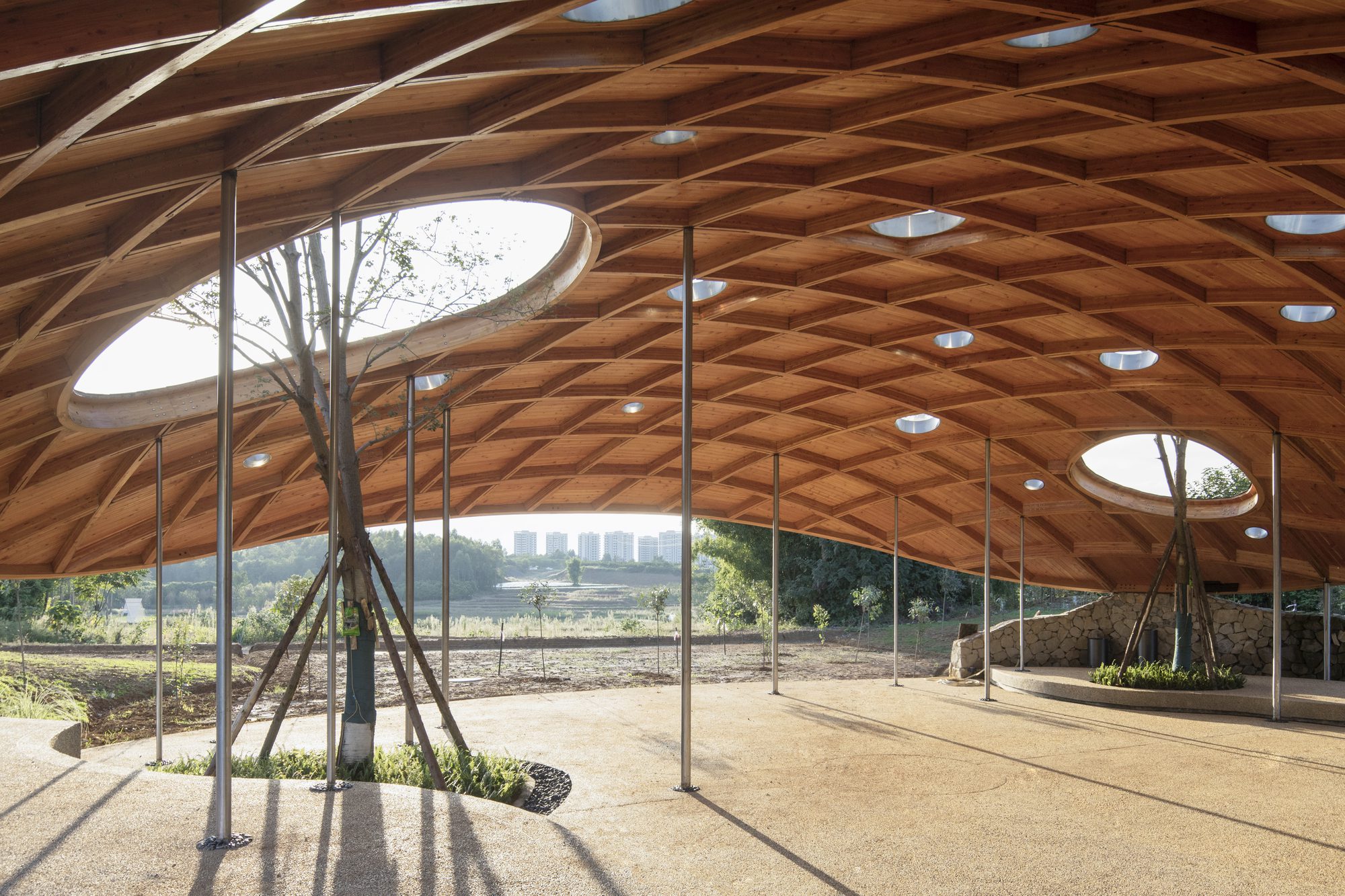 The core of the building is a wooden dome, with a roof that stretches inward like a canopy, offering shelter to the space below. Three large skylights allow Chinese tallow trees to grow through the roof, blending with the surrounding woods, while over a dozen skylights of varying sizes introduce layered natural light, creating a bright and dynamic interior. The dome’s form and exposed wooden structure gently gather sound waves, producing a soft acoustic field ideal for music and artistic expression. The floor slopes along the direction of the lake, forming curved steps that serve as both audience seating for performances and partitioned leisure areas. This design enhances the space’s centripetal nature, accommodating both group activities and individual meditation. The delicate cluster of columns, resembling banyan aerial roots, echoes the scale of the surrounding tree trunks. People can lean against these columns, establishing a direct connection with the architecture and strengthening the bond between humans and nature.