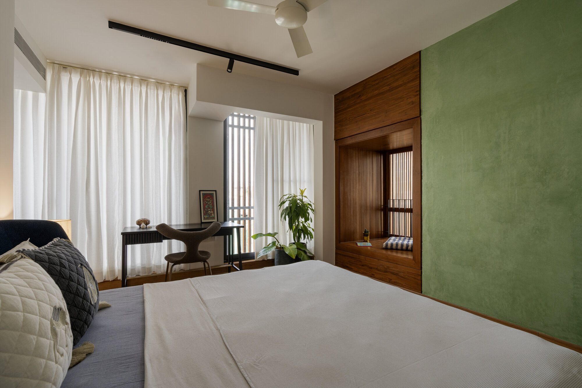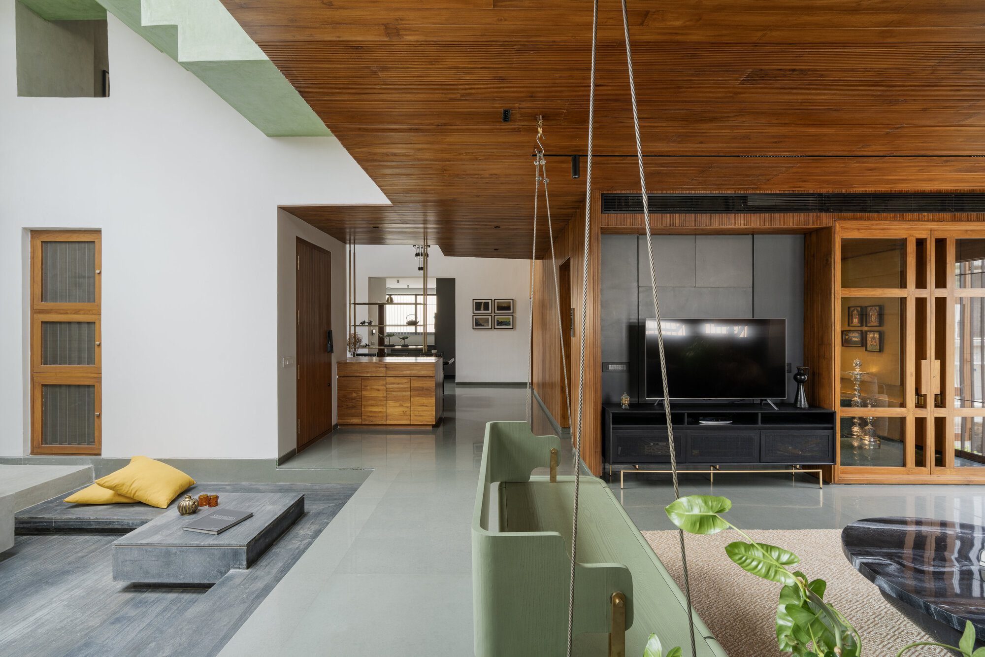 A skylight above ensures the space is always filled with diffused natural light. The courtyard connects the living room, dining area, and the upper-level commons, creating seamless spatial integration across floors. It becomes the family’s gathering place, a zone for conversation, play, rest, and celebration. A pastel green swing with brass detailing, suspended delicately within this space, becomes a visual and physical bridge between the courtyard and the adjacent seating areas. It is both nostalgic and modern, a symbolic reminder of how the old and the new coexist in this home.