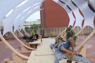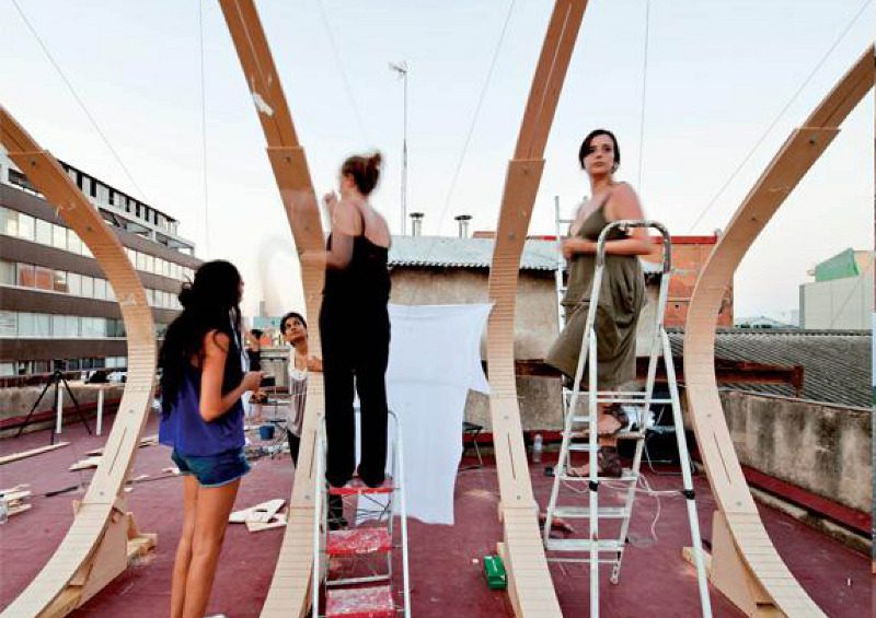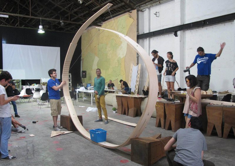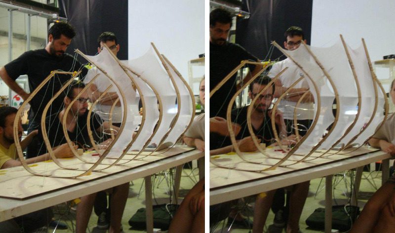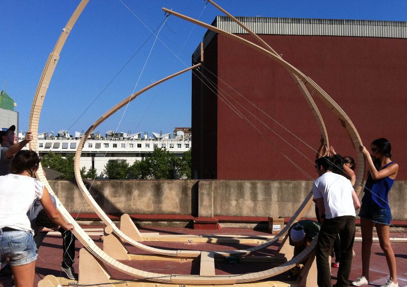 The structure is made of rib like bent wood that incorporates solar panels into its skin. The IAAC explains the project, stating that, ‘It is a solar pavilion with the attribute of transforming its structure, so as to follow the sun path and get the maximum advantage of the solar radiation, to be captured by the solar panels incorporated on its skin.