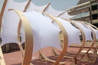 The ribs are held bent by tensile cables attached to sensor controlled winches which allow the wood to relax or pull the curvature tighter as the sun moves through the sky, maximizing solar reception.
