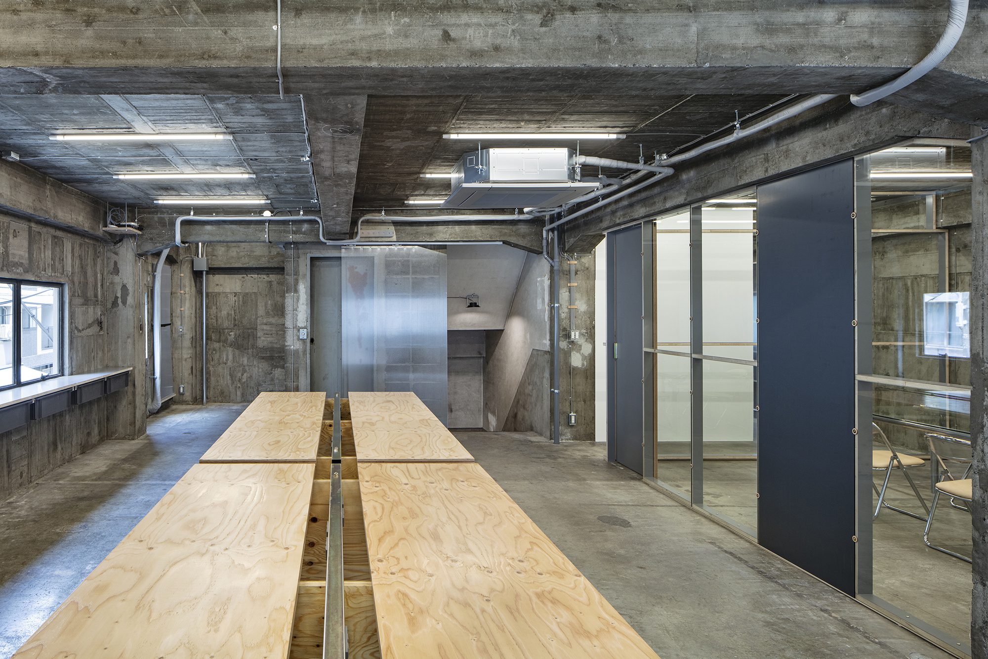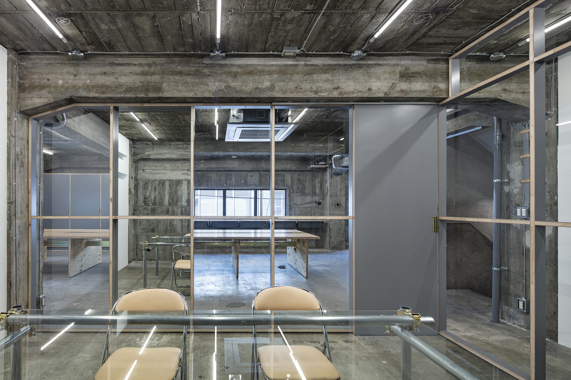 This is why we decided to leave the bare walls as they are as much as possible. Shelves and partitions around the walls are made of raw-edged gray poly lumber to accentuate the edges. One of the glass partitions separating the office and meeting room is a mirror, and the gray surface visible from the office is the back of the mirror used as a finish. Since the mirror and glass are the same thickness, raw edges of both materials were joined without seals along the edges like glass. The glass and mirror are fixed directly with screws using leather as washers. The exposed electrical wiring carefully laid out in the concrete walls is also held in place using raw-edged leather. The meeting space is furnished with a glass table on legs made of steel pipes for scaffolding and leather upholstered chairs by Hender Scheme.