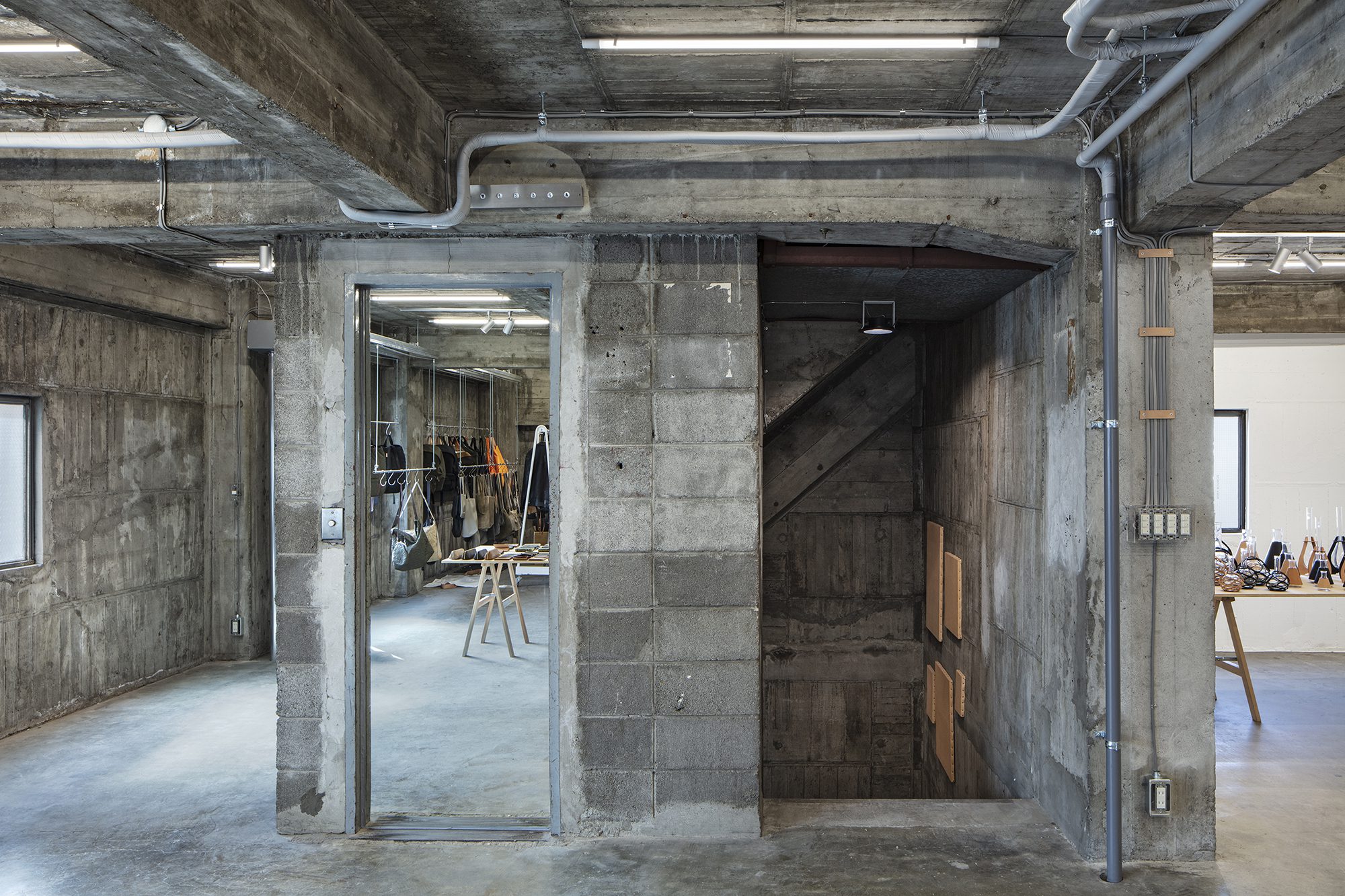 Hender Scheme Kuaramae is to renovate an entire concrete building near Kuramae Station into a showroom and office for IaicoS, which operates Hender Scheme and Polyploid. There are a few simple, specific rules for this space. The first is to use raw-edged materials as they are without significant edge treatment except for deburring. The second is to use the colors of materials as they are as much as possible without color matching. The third is to treat opposites, such as craft/industrial, front/back, artificial/natural, and cheap/luxurious as equally as possible.