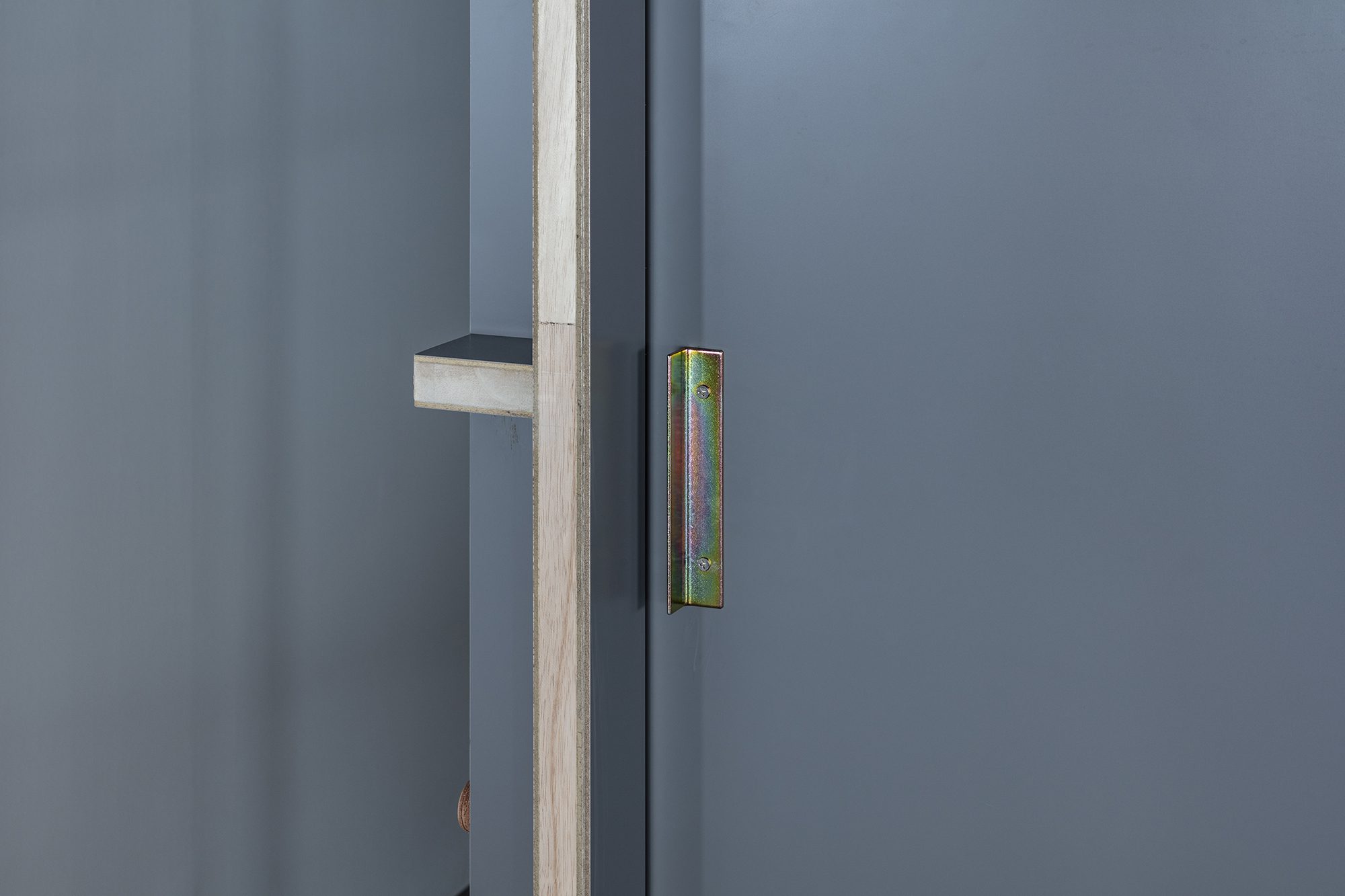The shelves on the exterior wall side are usually used as open shelves for documents and can be blindfolded during biannual exhibitions. The screens are made of raw-edged polycarbonate panels that can be attached and removed with magnets, without intricate detailing like fittings. They are lightweight and translucent with no oppressive feeling, and above all, they do not block the light from relatively small windows.