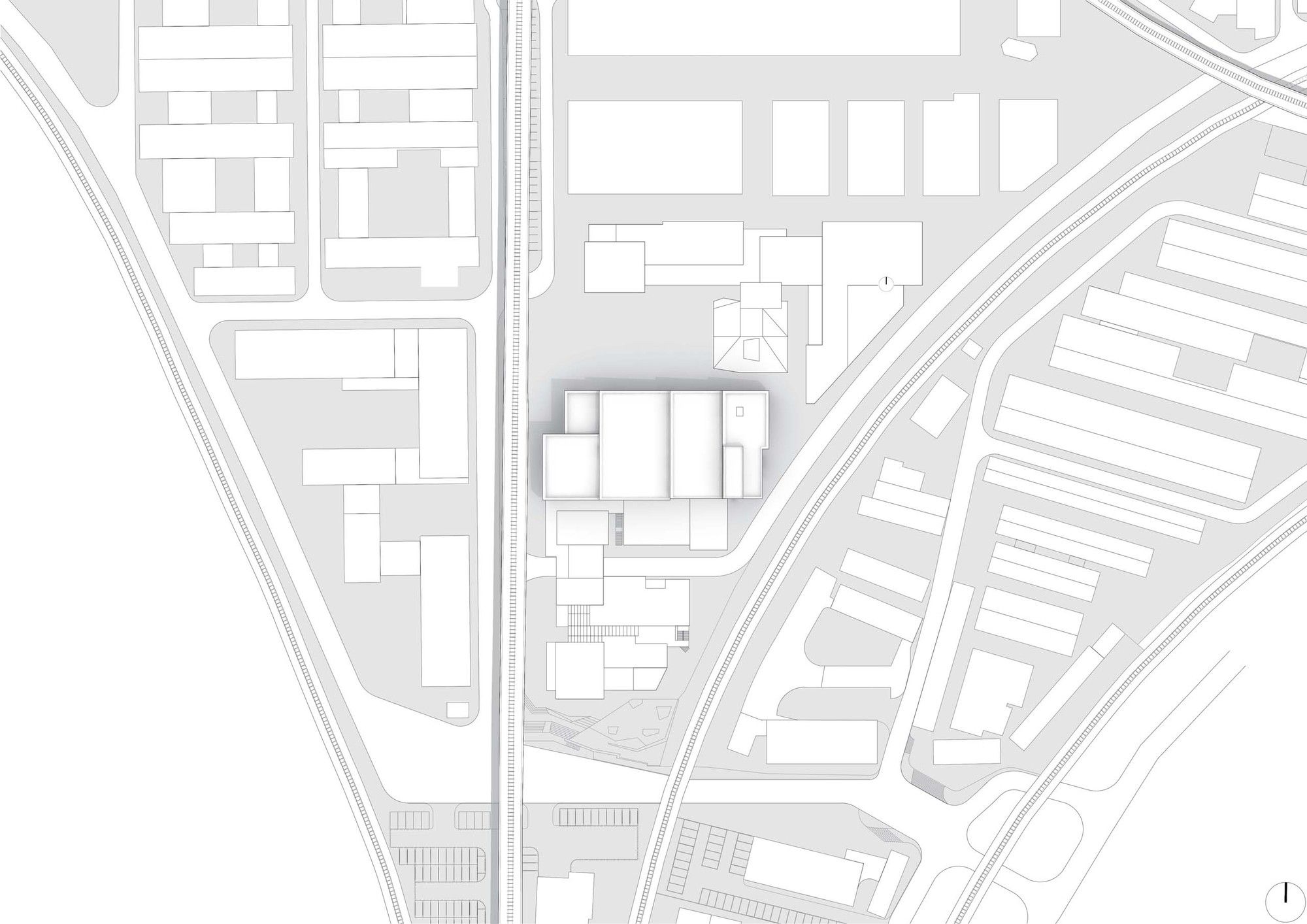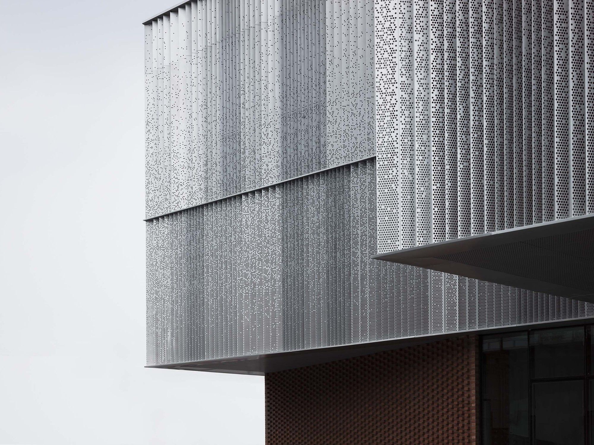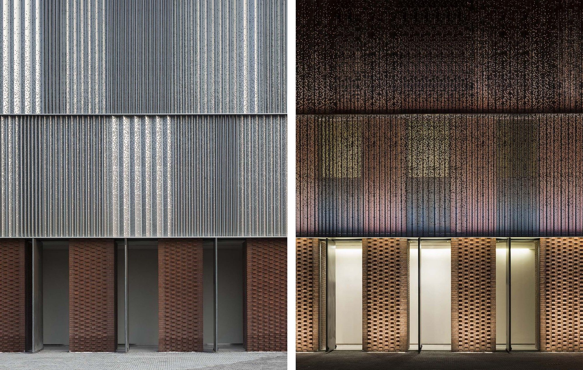 The exterior architectural presence is characterized by a perforated-folded metal cladding with saw-toothed volume that grows out of the shape of a plant building, and gradually extends forward, twisting at the end as it almost touches the elevated railway, forming a sense of ephemeral levitation. It also enriches the surrounding neighborhood’s dull skyline, not only with its decisive shape but also with its echoing to the ever-changing skylight.